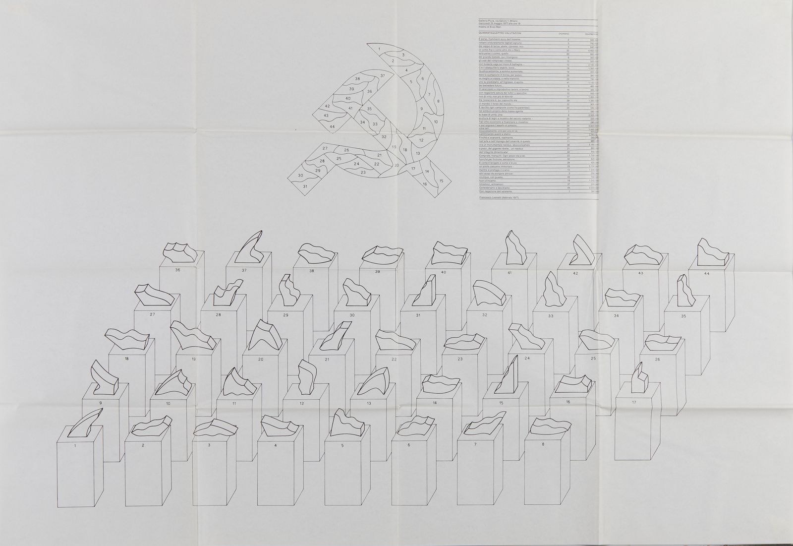 titolo.edizione totale: 150 esemplari. Edizione realizzata in occasione della prima mostra della serie di sculture '44 valutazioni', presso la Galleria Plura, Milano, il 25 maggio 1977, esposte poi alla Biennale di Venezia del 1978. Tiratura non presente. Lievi difetti.