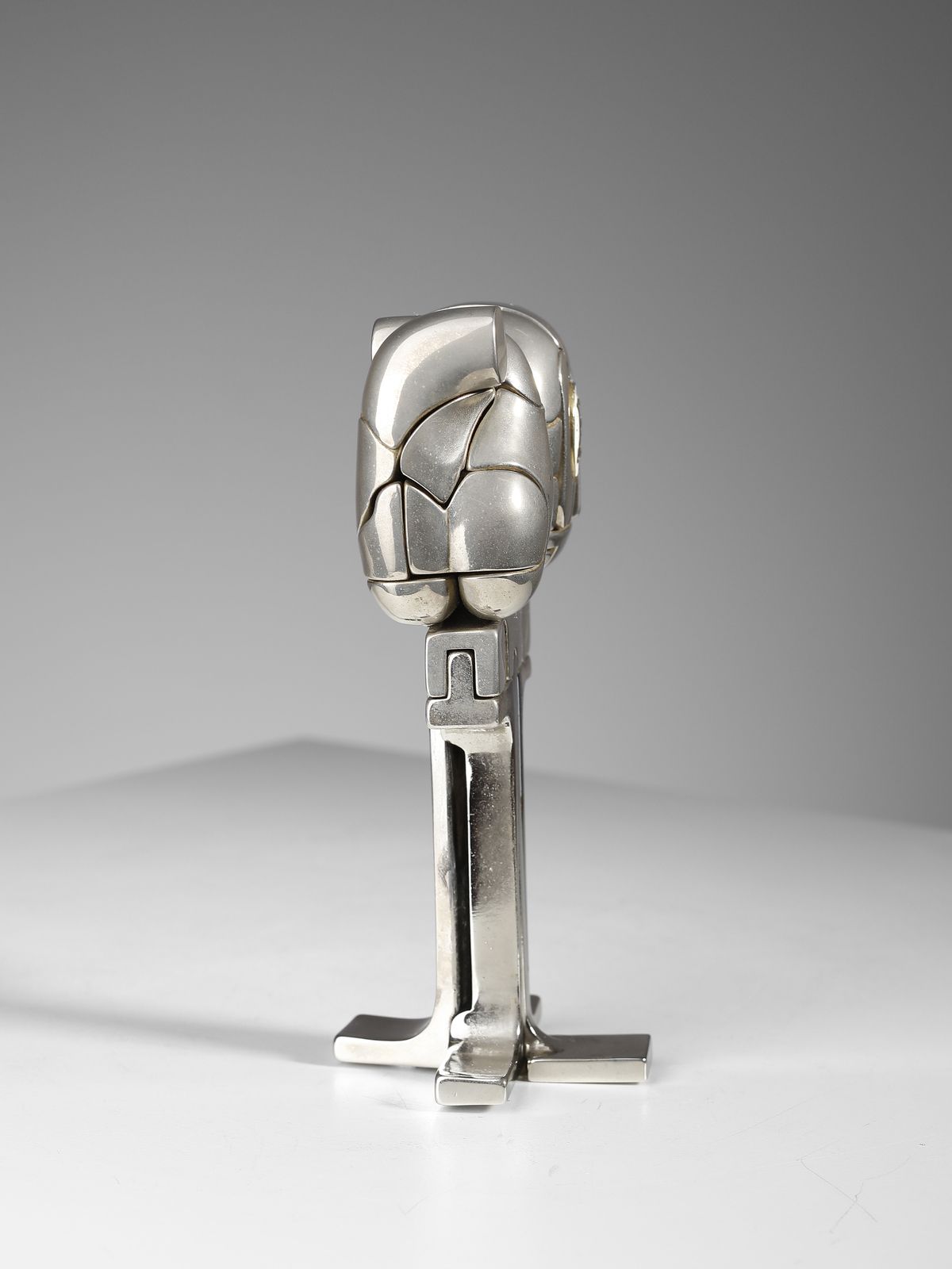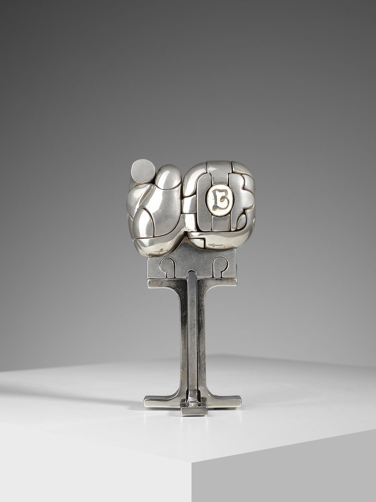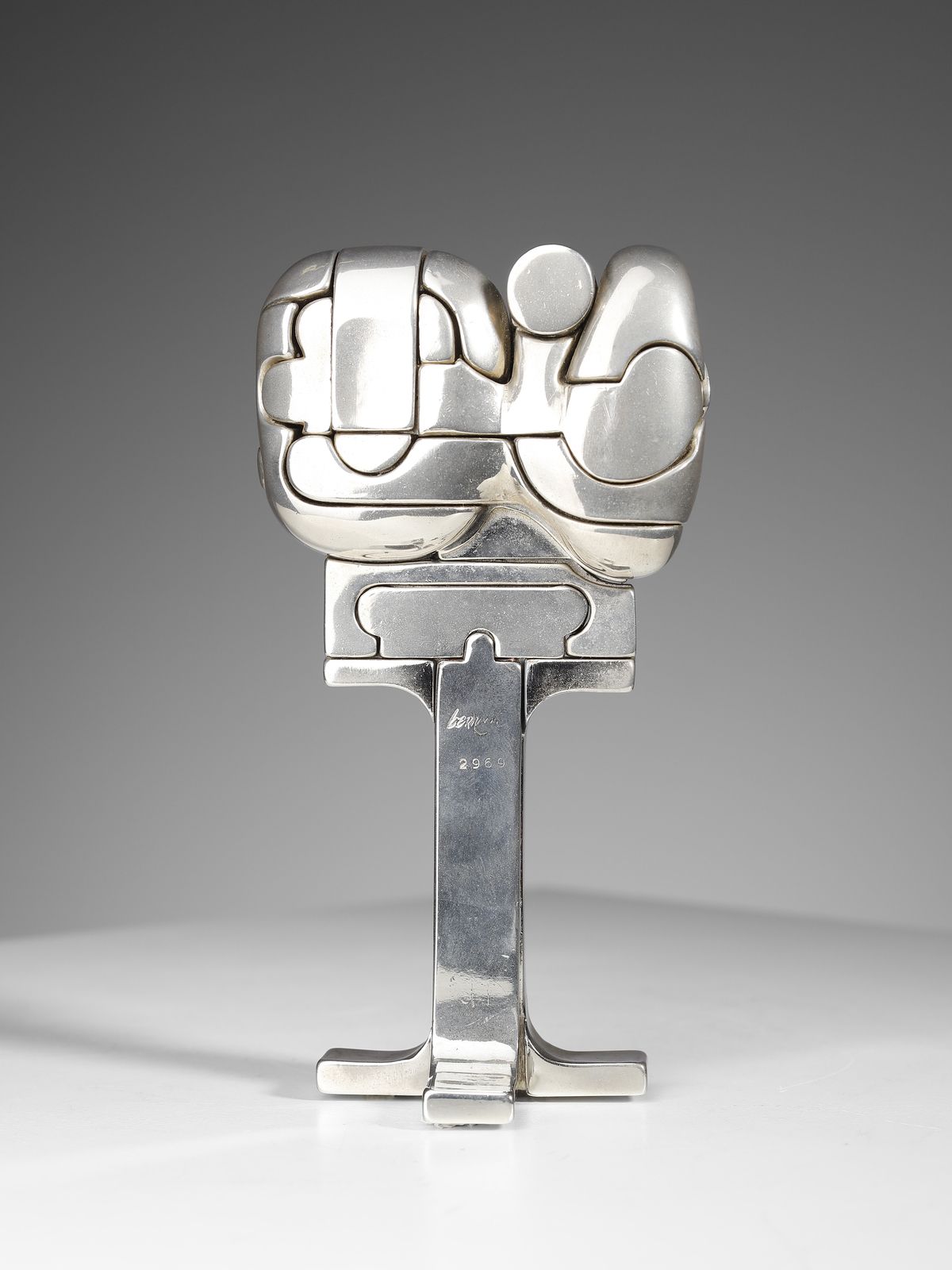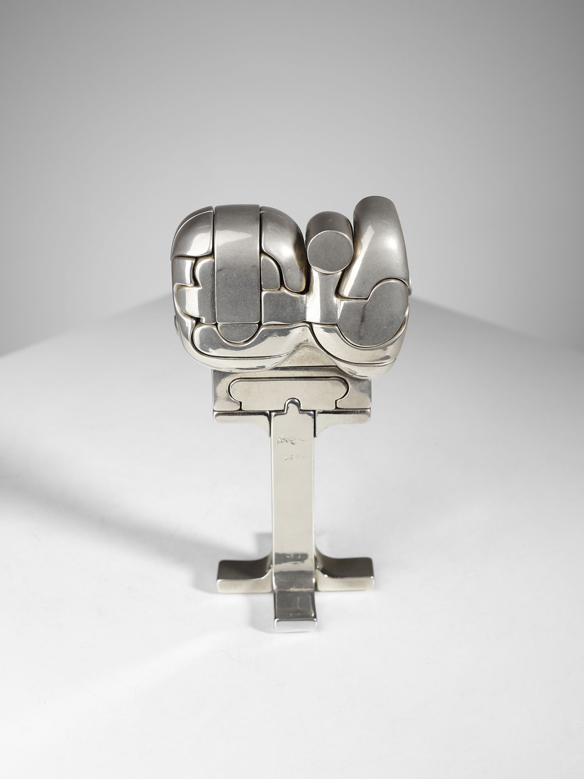 tiratura e firma incisi, es. 2969.scultura smontabile composta da 25 elementi, uno dei quali consiste in un anello. edizione totale: A) Edizione di Lusso: realizzata in cera persa, comprende: 6 esemplari in oro fino, a 18k, marchiati con un punzone riservato esclusivamente ai pezzi in oro numerati da 1 a 6 e muniti del certificato di autenticità. Nell'anello è incastonata una pietra preziosa + 500 esemplari in argento massiccio, firmati e numerati da 1 a 500. B) Edizione normale: In questa edizione gli elementi formanti la scultura, che vanno da n.14 al 25, sono stati modificati. La scultura che ne risulta ha le seguenti dimensioni: 9.6x6.2x3.7 cm. Gli esemplari sono stati realizzati ad iniezione e l'edizione comprende: 9500 esemplari in metallo nichelato firmati e numerati + n. illimitato di esemplari in materia plastica opaca.