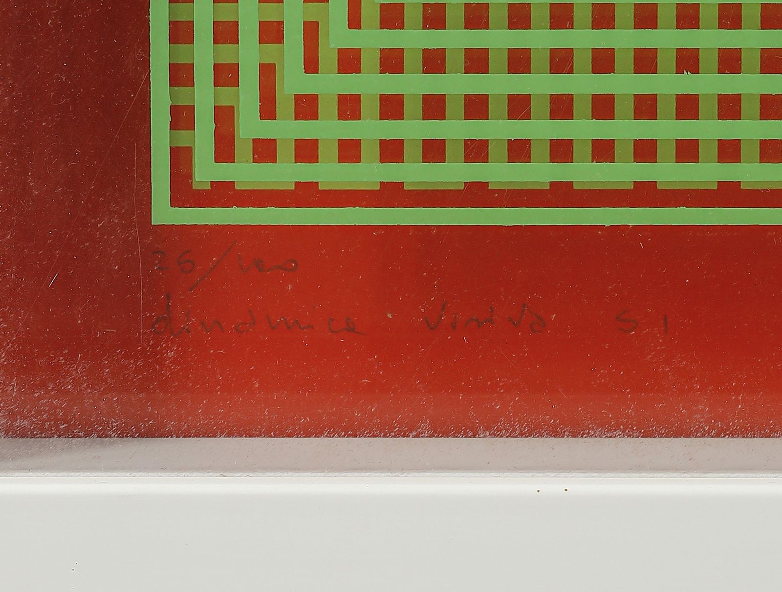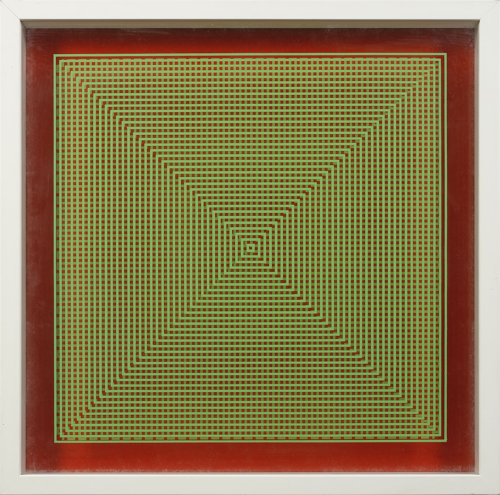 firma, tiratura, titolo e data a matita, es. 26 /100. edizione totale: 100 + X esemplari.editore: Giuseppe Strano, Padova.stampatore: Tipografia Antoniana, Padova.Foglio proveniente da una cartella contenente cinque serigrafie cinetiche di Alberto Biasi: progetto S1, dinamica visiva in verde su fondo rosso, doppia serigrafia su cartoncino mat e su acetato trasparente. Progetto S2, dinamica visiva in azzurro e nero su verde sfumato bianco, doppia serigrafia su cartoncino mat e su acetato trasparente. Progetto S3, interferenza rosso e giallo su Sfondo grigio, serigrafia su cartoncino mat. Progetto S4, trasparenza cinetica in blu su fondo grigio chiaro, doppia serigrafia su cartoncino mat e su acetato trasparente. Progetto S5, rilievo 4 in blu e giallo su fondo verde, doppia serigrafia su cartoncino mat sovrapposti, cartoncino superiore fustellato a zig zag con tagli corti verticali per l'incastro.