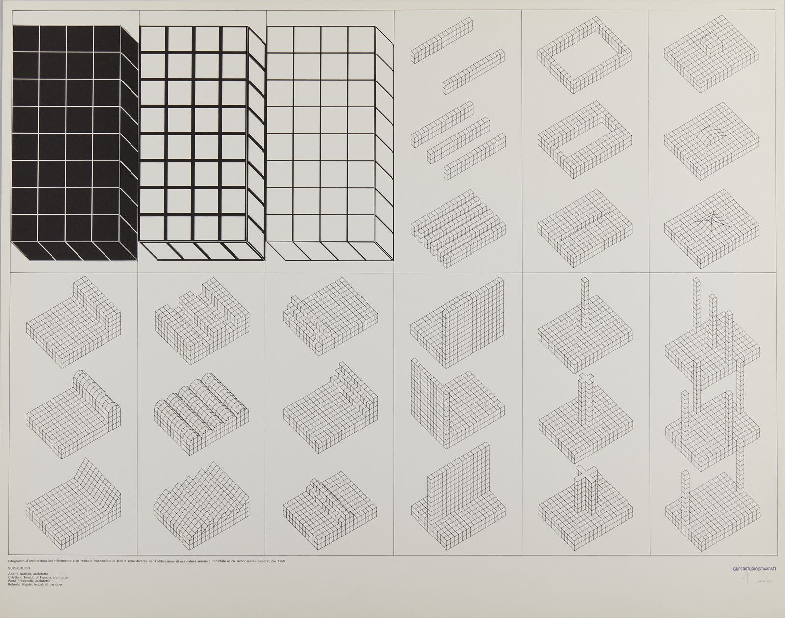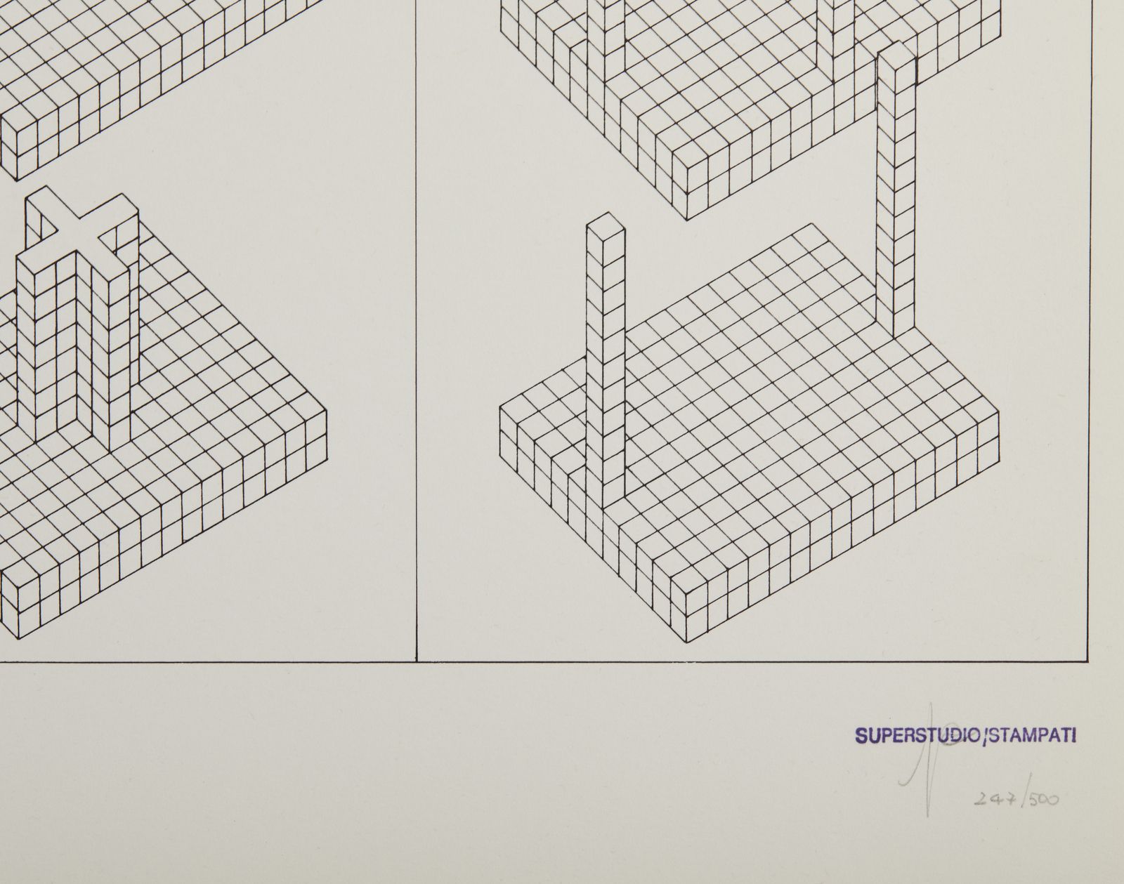 tiratura e firma, es. 247/500. titolo e data a stampa.edizione totale: 500 + XX esemplari.edizioni Plura, Milano.Il gruppo Superstudio, fondato a Firenze nel 1967 e composto da Adolfo Natalini, Cristiano Toraldo di Francia, Roberto Magris, Piero Frassinelli, Alessandro Magris, con Alessandro Poli dal 1970 al 1972, è stato attivo fino al 1978 e ha svolto attività di ricerca sperimentale e teorica sulla progettazione. Con gli Istogrammi d’Architettura, Superstudio, portava a compimento il percorso di antidesign, in cui vengono rappresentati dei diagrammi mentali liberi da modelli e imitazioni.