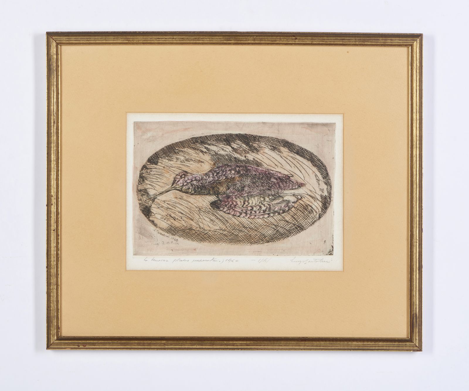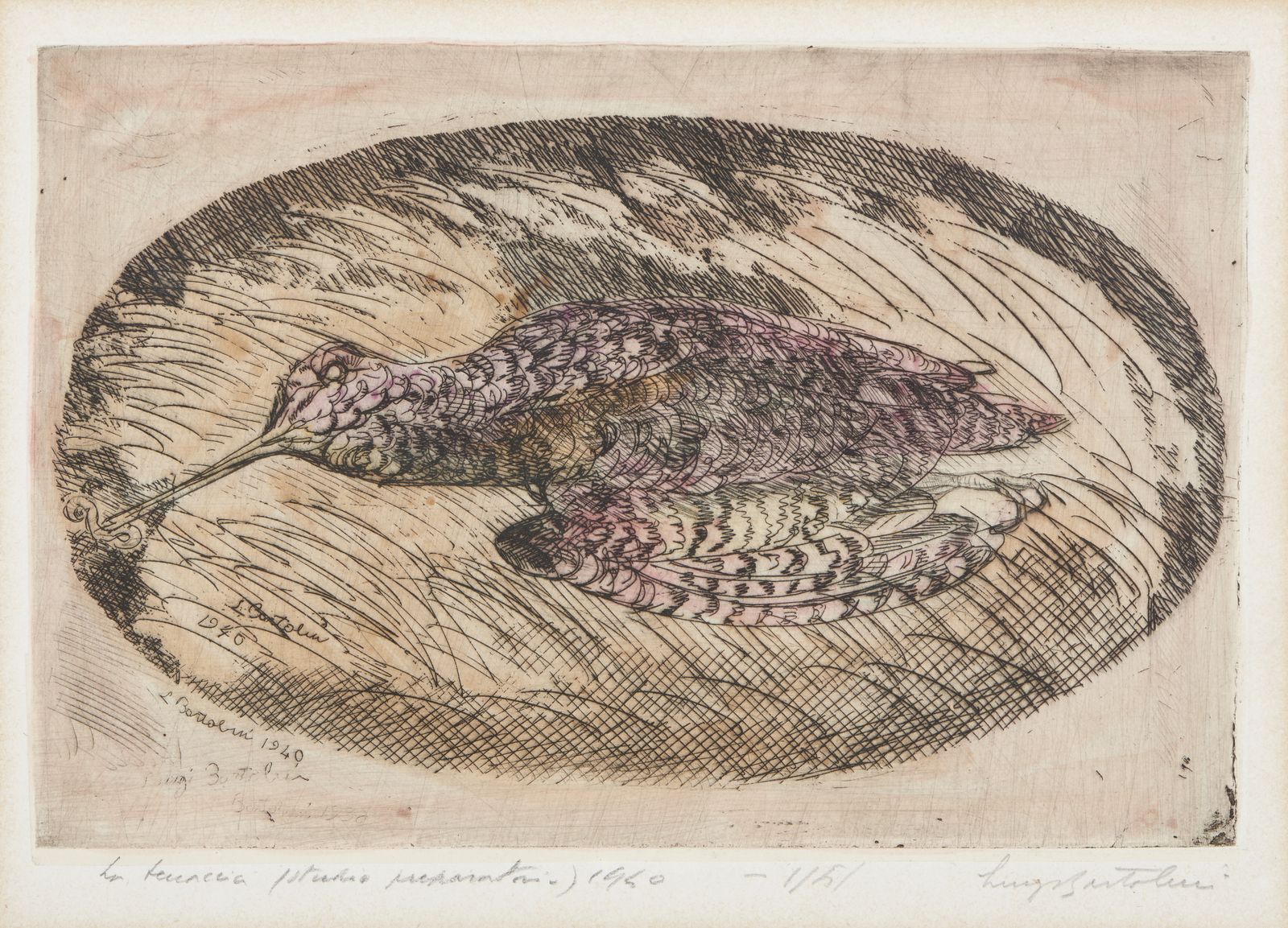 titolo, firma e data.edizione totatle: 10 esemplaridimensione lastra: 23,5 x 15,7 cmBIBLIOGRAFIA:1951 C.A. Petrucci, Le incisioni di Luigi Bartolini, Calcografia Nazionale Roma, n. 771 (altro es.).1962 G. Ronci, Le incisioni di Luigi Bartolini, Calcografia Nazionale Roma, n. 771 (altro es.).1967 Catalogo Galleria Viotti Torino n. 32. (altro es.).1972 C. Barsanti, Catalogo aggiornato dell’Opera Grafica di Luigi Bartolini, Galleria Marino Roma n. 893. (altro es.).1992/93 Catalogo Prandi 208 n. 41 altro es.)ESPOSIZIONI: 1947 Stoccolma, Mostra dell’Incisione Italiana (altro es)1949 Modena, Galleria La Saletta (altro es)1954 Livorno, Bottega dell’Arte (altro es)1954 Bologna, Galleria Circolo di Cultura (altro es)1955 Bellinzona, Circolo di Cultura (altro es)1972 Roma, Galleria Marino (altro es)SITOGRAFIA:https://www.luigibartolini.com/acqueforti-1938-1940/la-beccaccia