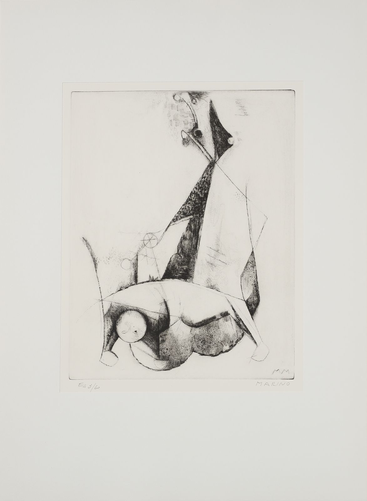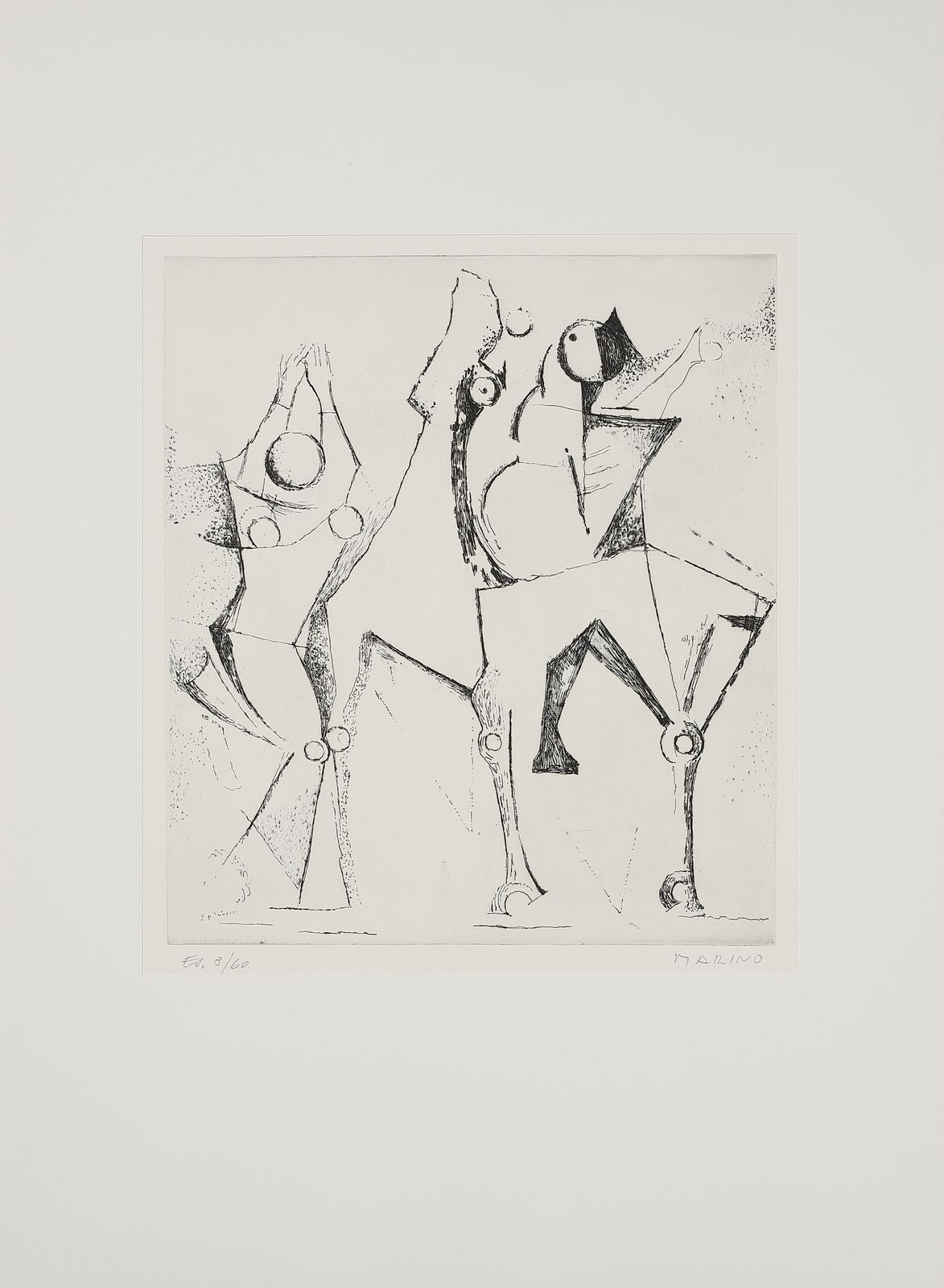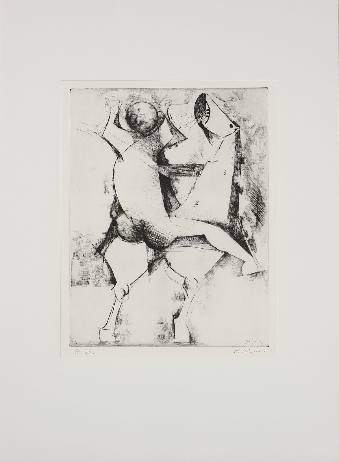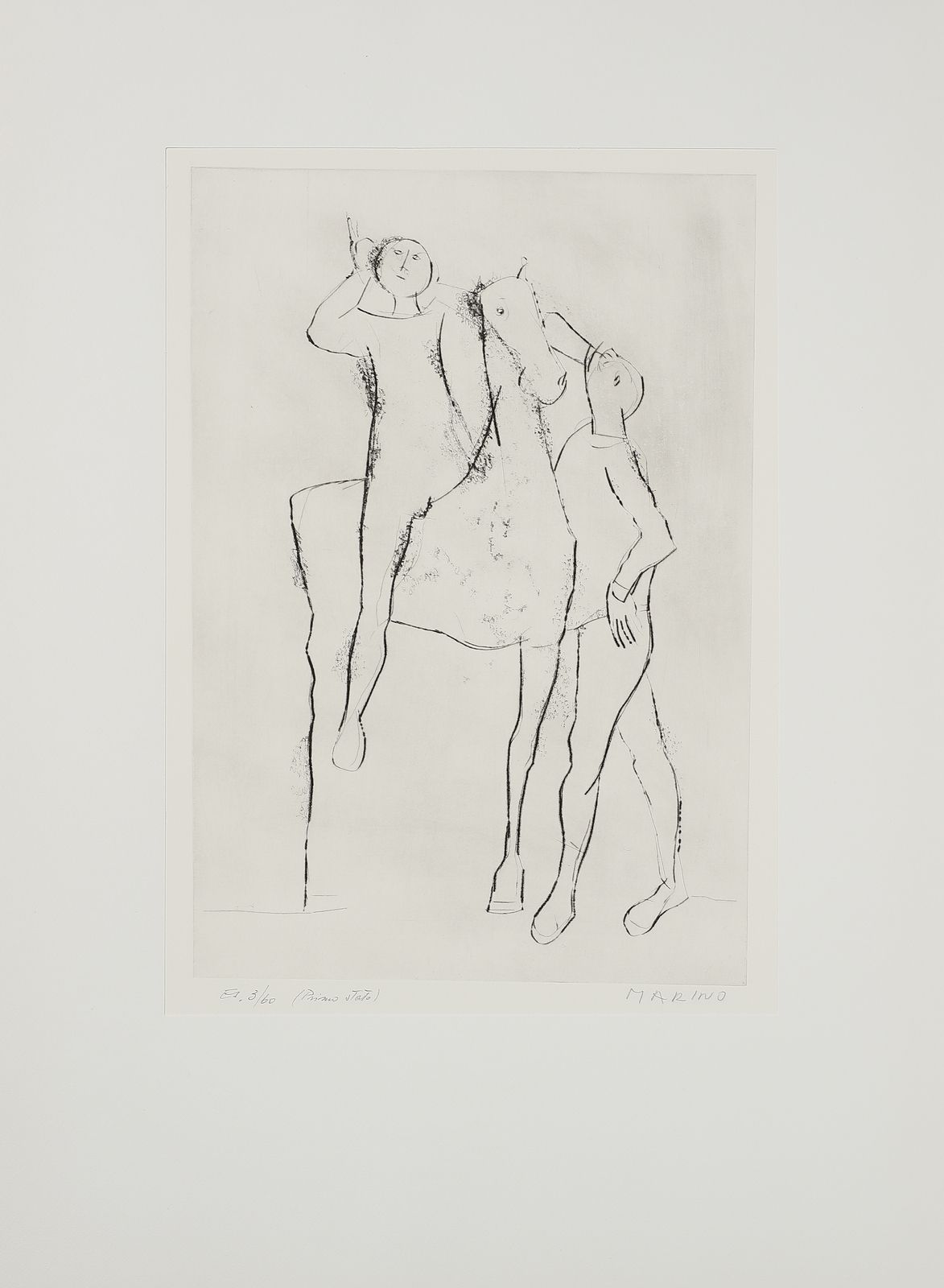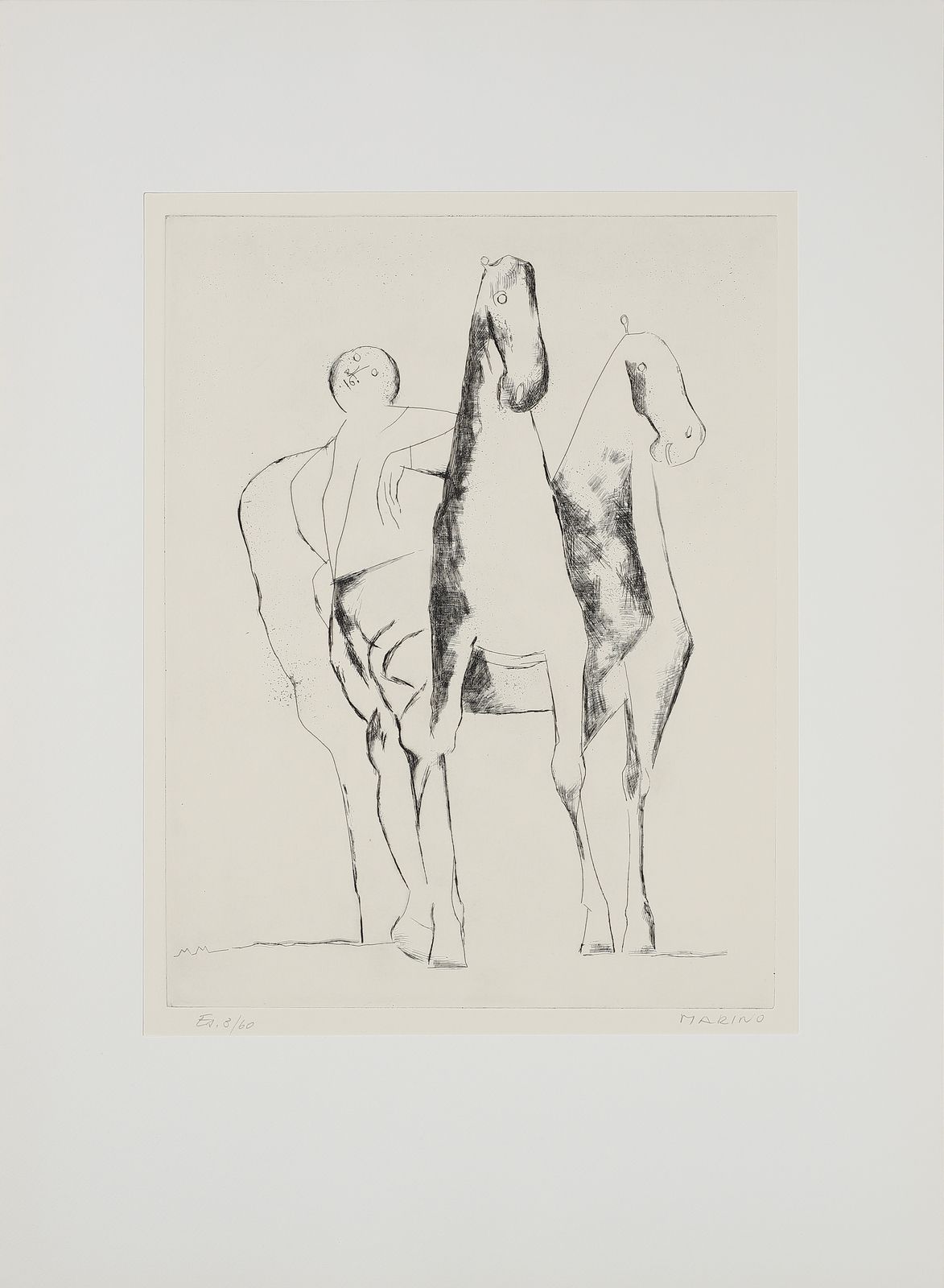 ogni foglio è firmato e numerato a matita, es. 3/60.timbro a secco Luigi De Tullio stampatore.dimensione lastra: 44.2x36.8 cmedizione totale: 60 esemplari firmati e numerati da 1/60 a 60/60. 20 esemplari numerati da I/XX a XX/XX + 5 esemplari fuori commercio contrassegnati dalle lettere A, B, C, D, E.Editore e stampatore: Luigi De Tullio, Milano.BIBLIOGRAFIA: G. e G. Guastalla, Marino Marini, Catalogo ragionato dell'opera grafica 1919-1980. Livorno: 1990, p.255PROVENIENZA:Collezione privata, Milano.