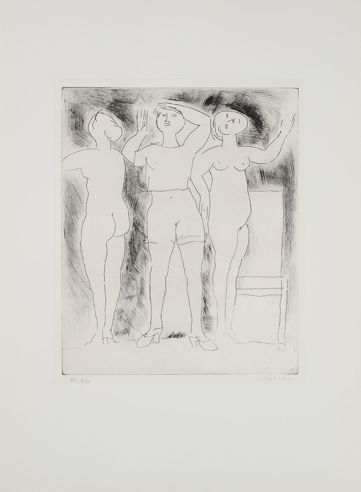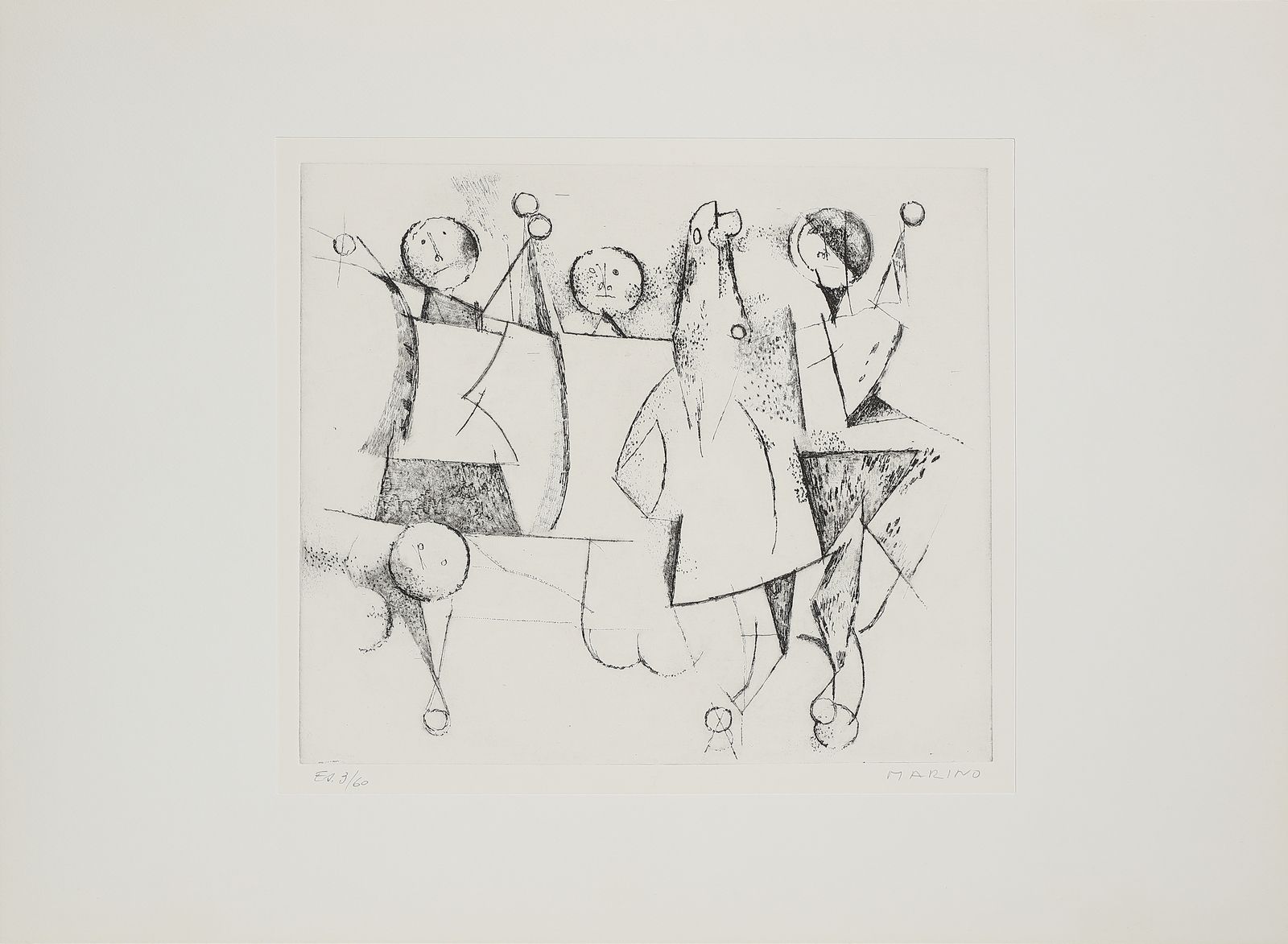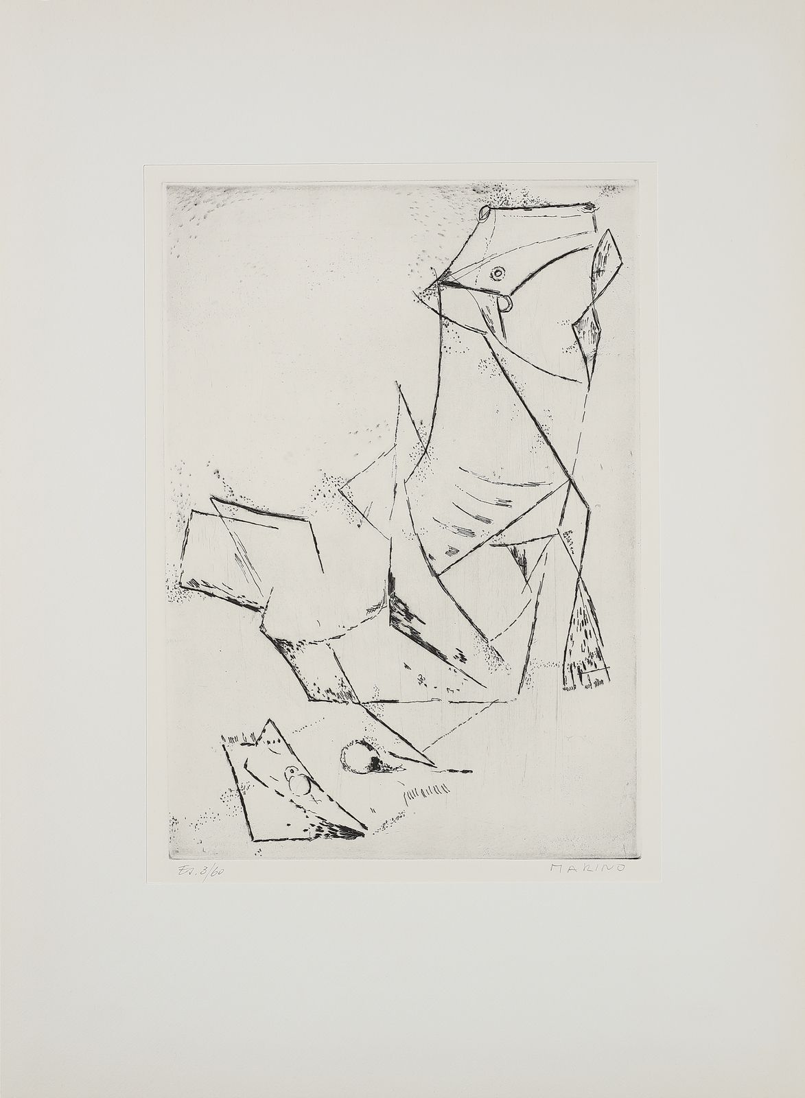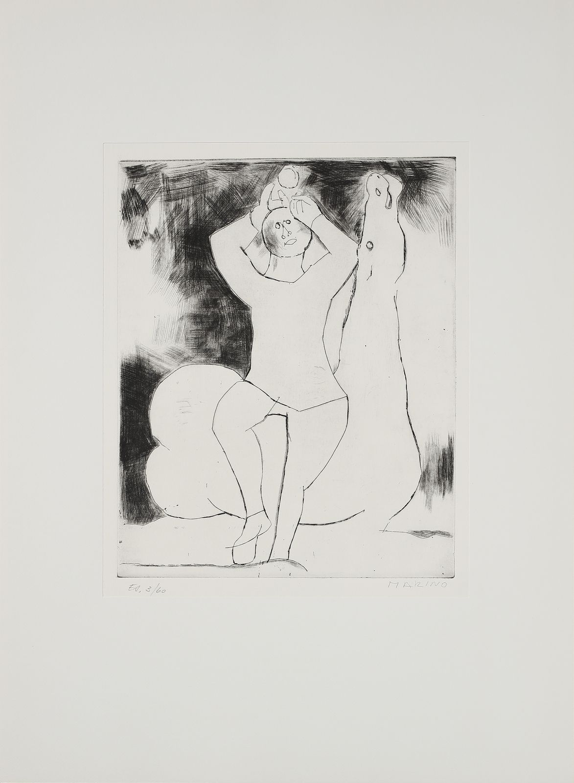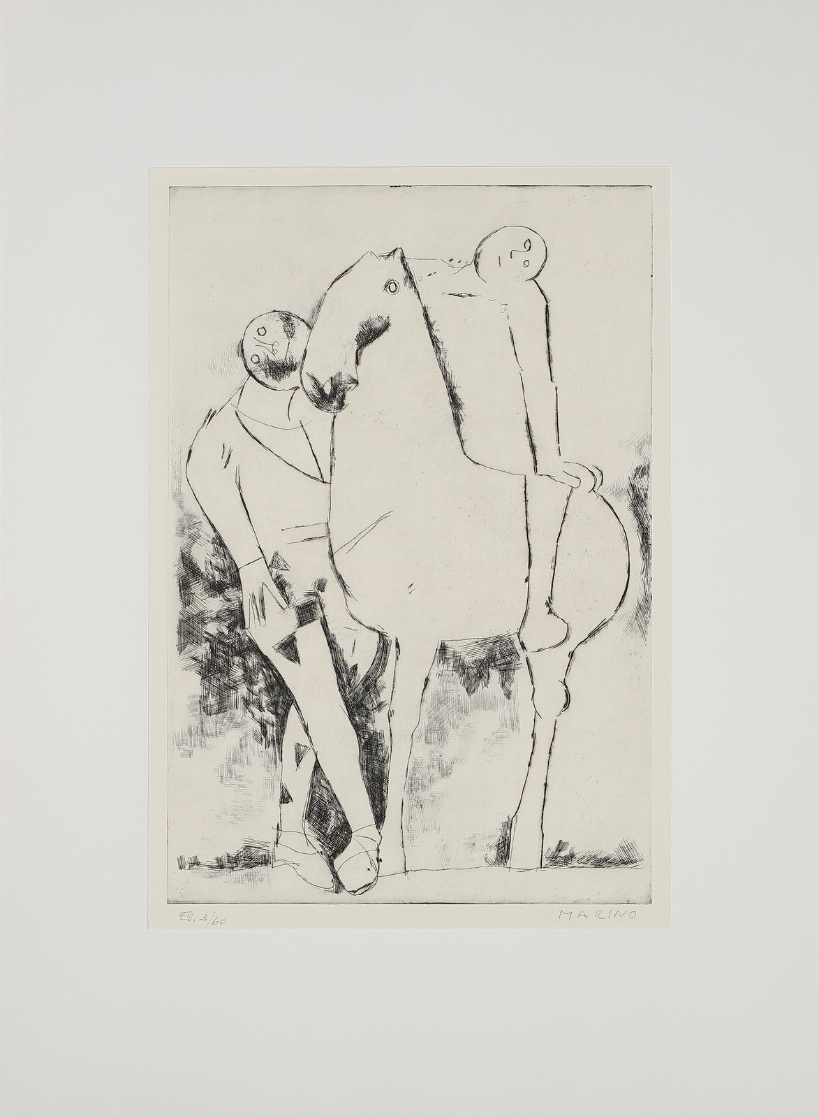 ogni foglio è firmato e numerato a matita, es. 3/60.timbro a secco Luigi De Tullio stampatore.dimensione lastra: 44.2x36.8 cmedizione totale: 60 esemplari firmati e numerati da 1/60 a 60/60. 20 esemplari numerati da I/XX a XX/XX + 5 esemplari fuori commercio contrassegnati dalle lettere A, B, C, D, E.Editore e stampatore: Luigi De Tullio, Milano.BIBLIOGRAFIA: G. e G. Guastalla, Marino Marini, Catalogo ragionato dell'opera grafica 1919-1980. Livorno: 1990, p.255PROVENIENZA:Collezione privata, Milano.