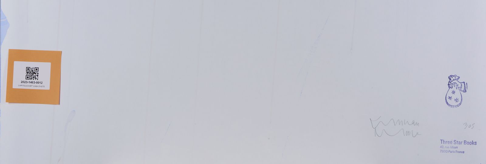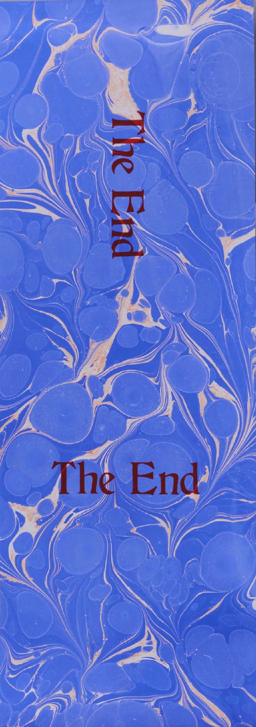 sul retro: firma e timbro Three Star Books, Parigi. serigrafia su carta marmorizzata. Il volume realizzato per Three Star Books,“The End”, è serigrafato sulle pagine. Il testo scorre sulla carta marmorizzata lungo le ventiquattro pagine stampate del libro imitando i ventiquattro fotogrammi di un secondo dei titoli di coda di un film.