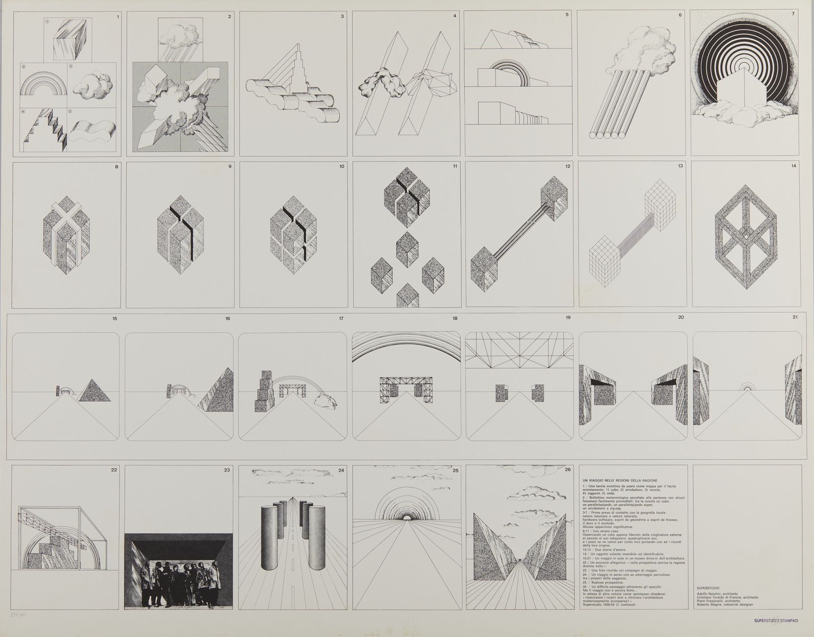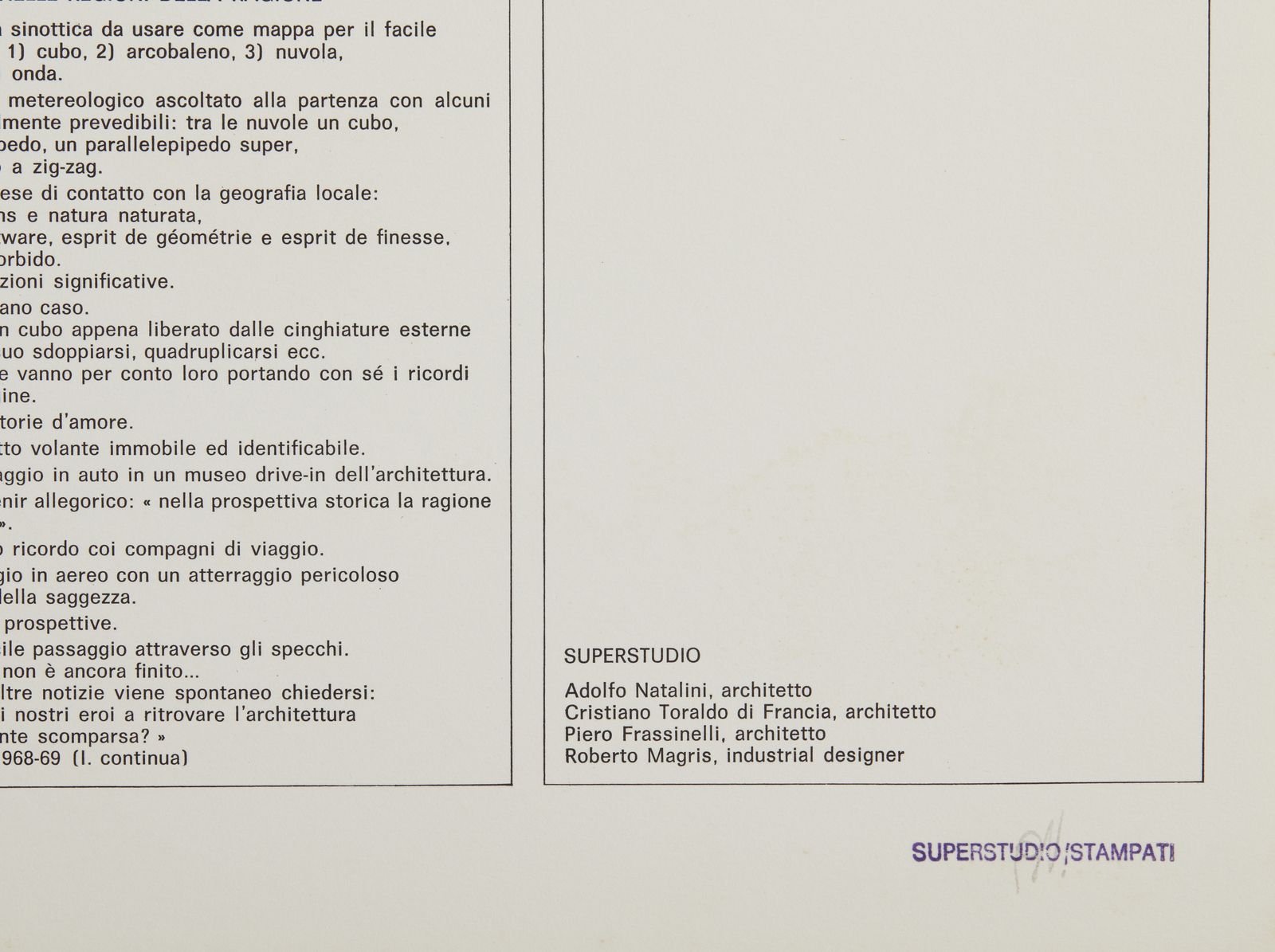 tiratura e firma a matita, es. 395/500.titolo e anno in basso a stampa. timbro Superstudio e timbro Plura Edizioni, Milano.edizione totale: 500 esemplari + XX. Plura Edizioni, Milano.Il gruppo Superstudio, fondato a Firenze nel 1967 e composto da Adolfo Natalini, Cristiano Toraldo di Francia, Roberto Magris, Piero Frassinelli, Alessandro Magris, con Alessandro Poli dal 1970 al 1972, è stato attivo fino al 1978 e ha svolto attività di ricerca sperimentale. e teorico sul design.