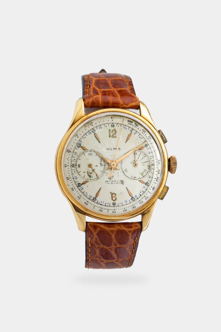Diam. 38 mm Cassa in oro con fondello a pressione. Quadrante argento con indici geometrici e numeri arabi applicati subcontatore dei secondi continui al 9 e dei 45 minuti al 3. Movimento a carica manuale Valjoux 92.