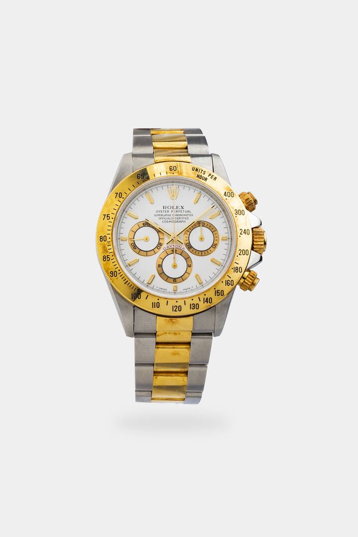 Diam. 40 mm Cassa in acciaio con fondello a vite e lunetta tachimetrica. Quadrante bianco con indici geometrici applicati indicazione dei secondi continui al 9 delle 12 ore al 6 e dei minuti cronografici al 3. Bracciale Oyster in acciaio e oro integrato con chiusura clasp. Movimento a carica automatica cal.4030. Orologio in condizioni definibili di NOS con adesivo sul fondello.