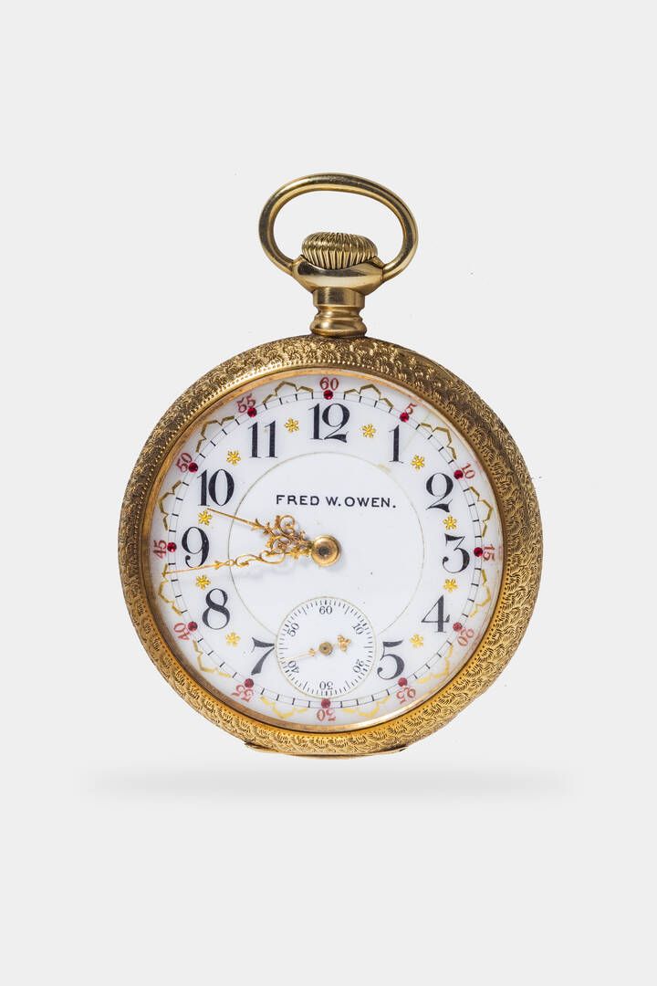 Diam. 51 mm Cassa in oro con fondello a scatto decorato. Quadrante porcellana con numeri arabi serigrafati. Movimento a carica manuale da revisionare.