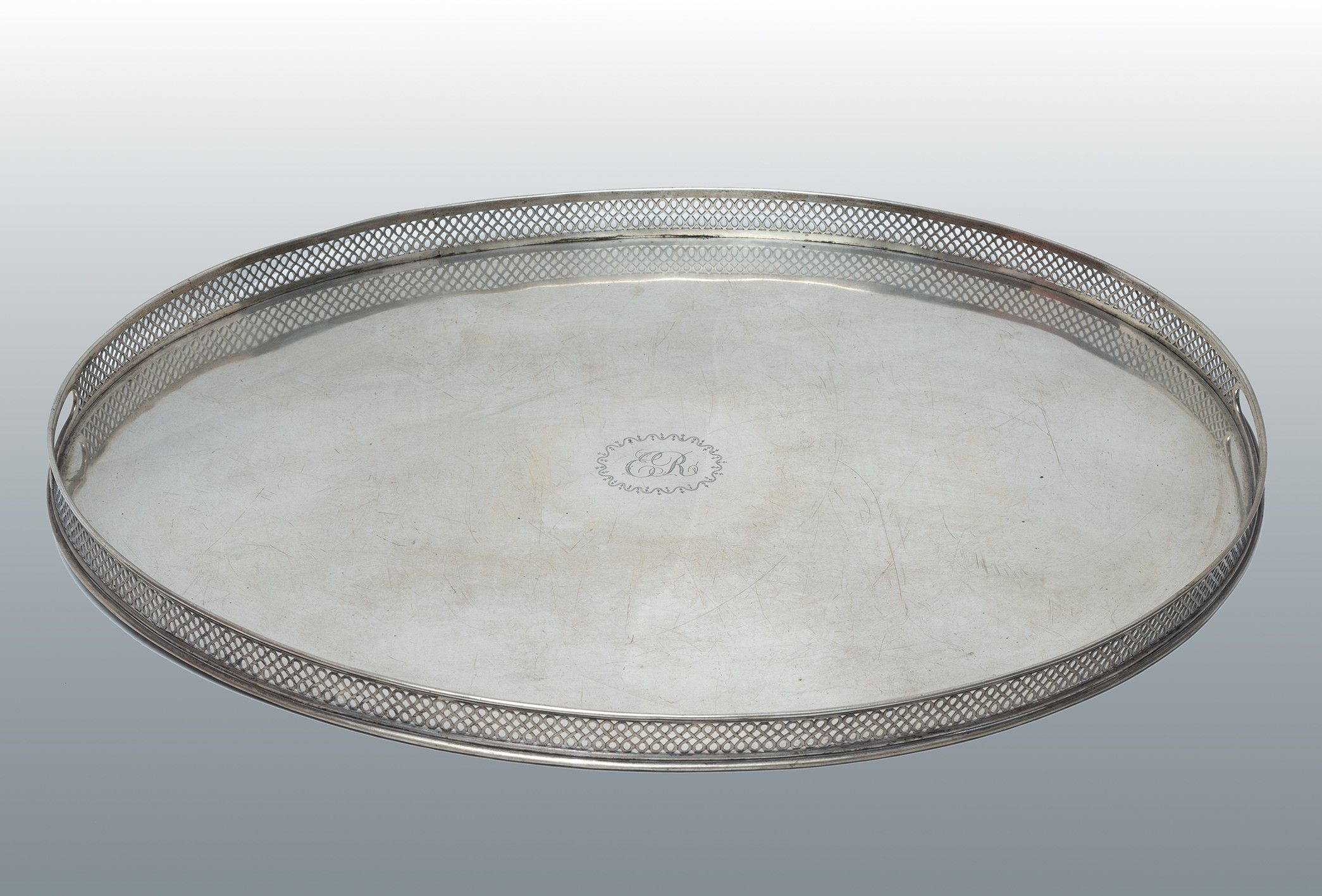 Ringhiera a traforo, doppio manico, con monogromma inciso E.R. al centro entro ghirlanda