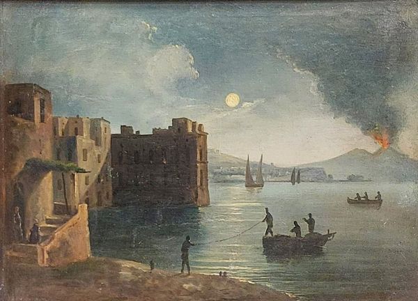 Napoli da una spiaggia di Posillipo, con eruzione del Vesuvio sullo sfondo