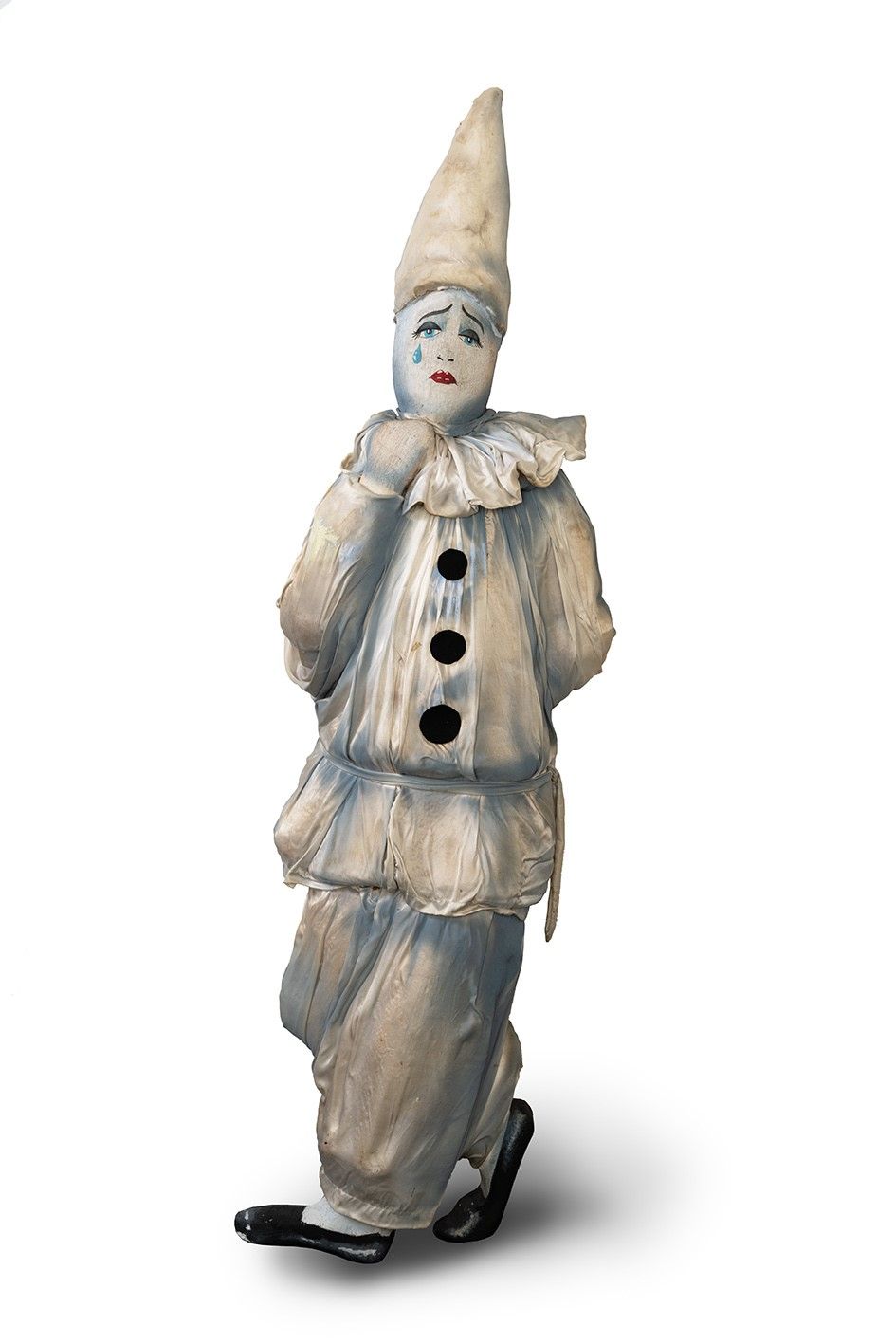 Scultura in polistirolo garzato dipinto in policromia con in abiti in stoffa, h 160x45x22 cm