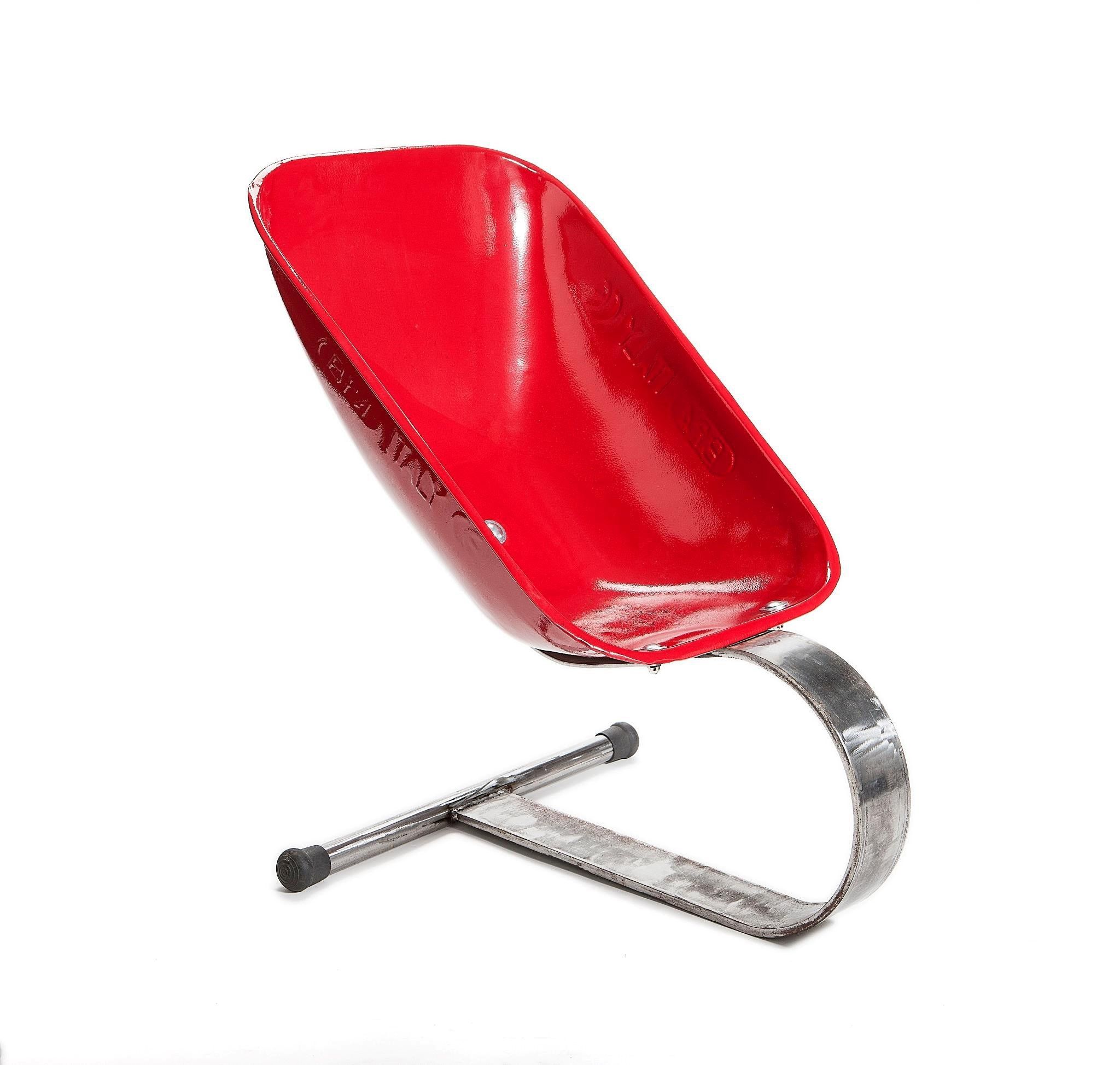La Poltrona Wheelbarrow è un oggetto che trae ispirazione dalla corrente “ready-made”, frutto di una costante ricerca da parte dei designers di abbattere le barriere stilistiche e materiche per sperimentare nuove forme ed utilizzi di oggetti estratti da differenti contesti. Si tratta di una vasca di carriola in lamiera stampata, che poggia su una balestra in ferro, quest’ultima permette alla persona seduta di poter piacevolmente oscillare. Il supporto in ferro crea un effetto sospeso della seduta valorizzandola e rendendo nel contempo l’insieme molto leggero. I due elementi sono uniti da tre perni e sono facilmente separabili per un imballaggio ridotto.Nel percorso formativo di Mario Pagliaro il piacere dell’evasione regalata dal disegno è una costante. La facoltà di architettura, fornisce a Pagliaro le regole necessarie per dare forma e progettualità alla sua sperimentazione.“Oriento la mia ricerca non tanto nell’inventare nuovi bisogni, ma nel creare l’oggetto giusto, per un bisogno vero.”