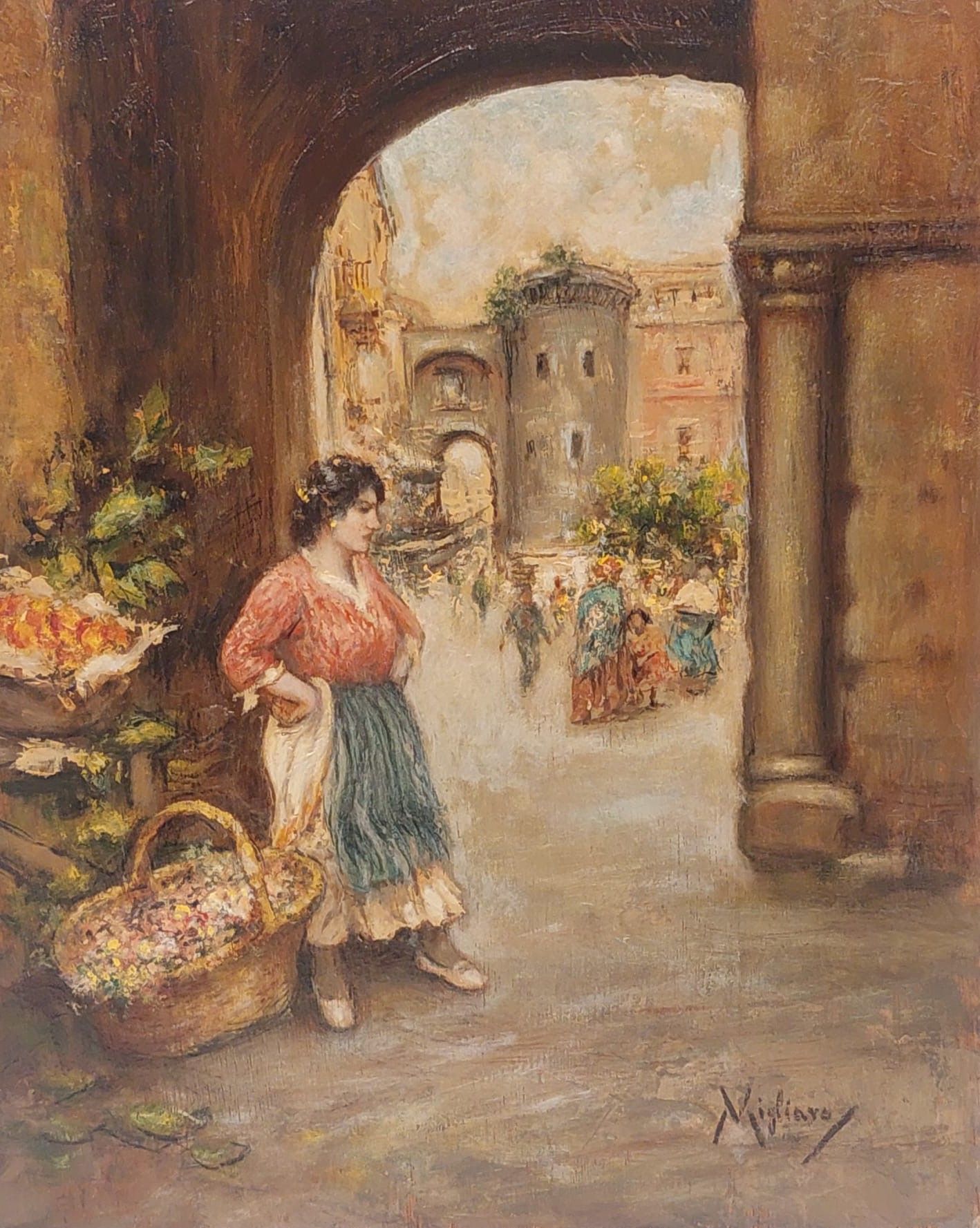 Nella pittura di Migliaro un gruppo di case non rappresentava solo uno spunto coreografico. L'arco di Sant'Eligio, il Basso Porto, Piazza Francese, il mercato, non erano fondali inerti che il pittore issava per accogliere per accogliere sviluppi di episodi e gesticolazioni colorite. Per il pittore, la struttura architettonica, non segnalavano solo una cadenza ritmica di volumi ma il segno della tradizione