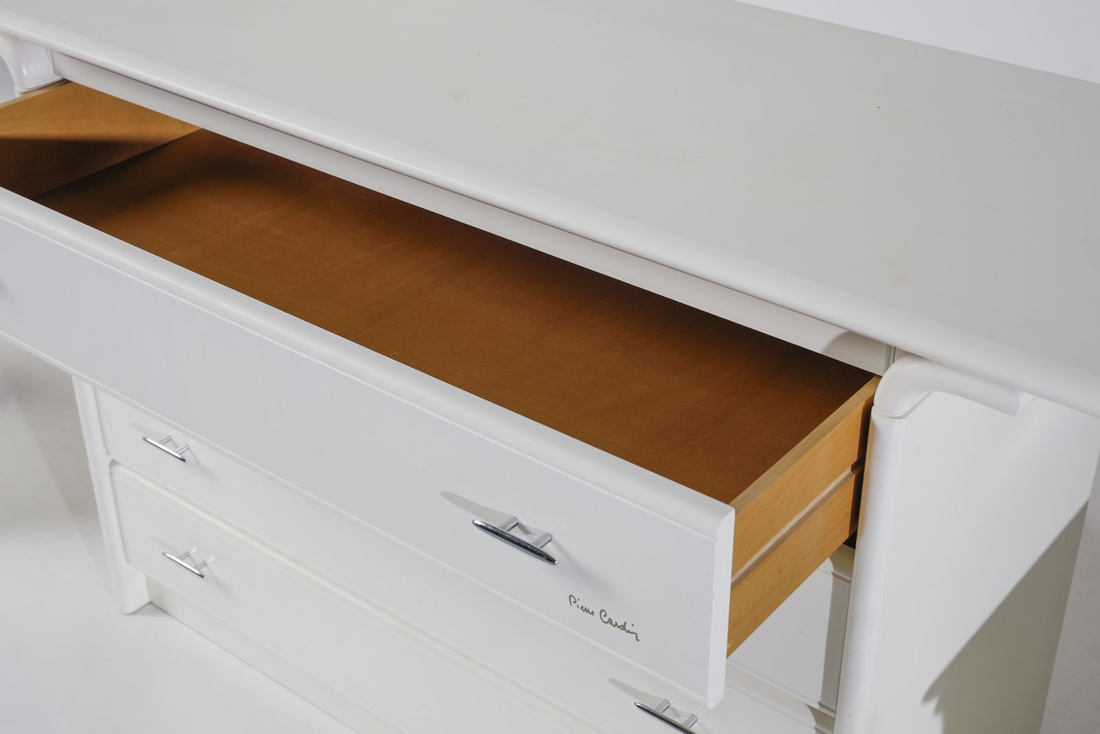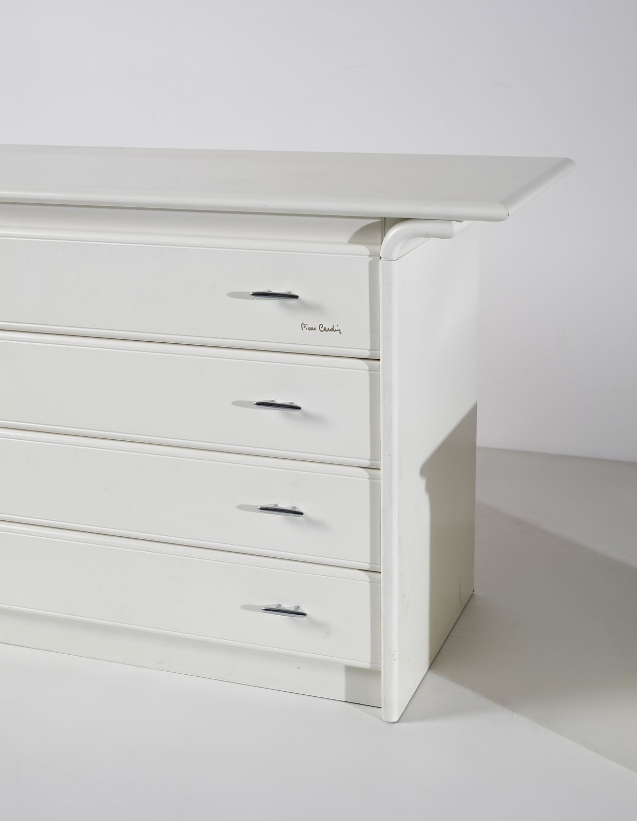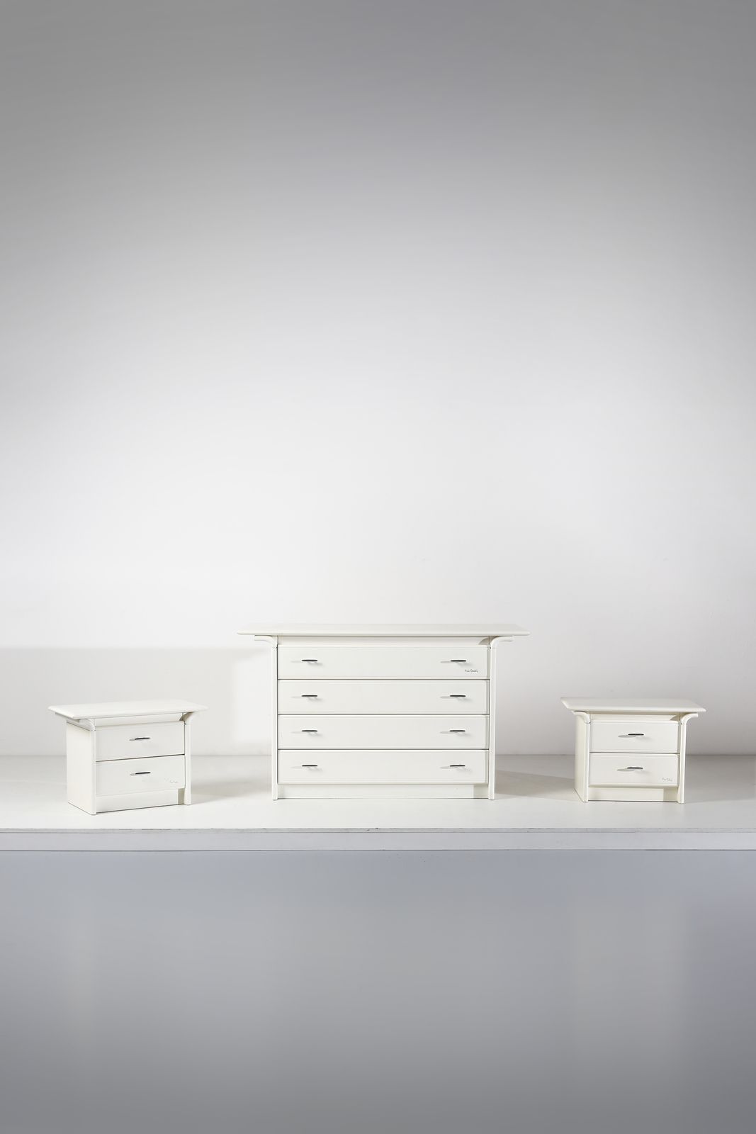 Anni Ottanta.Firma dell'autore.Dimensioni: cassettiera 86 x 145 x 53 cm. comodini 49 x 68 x 38 cm