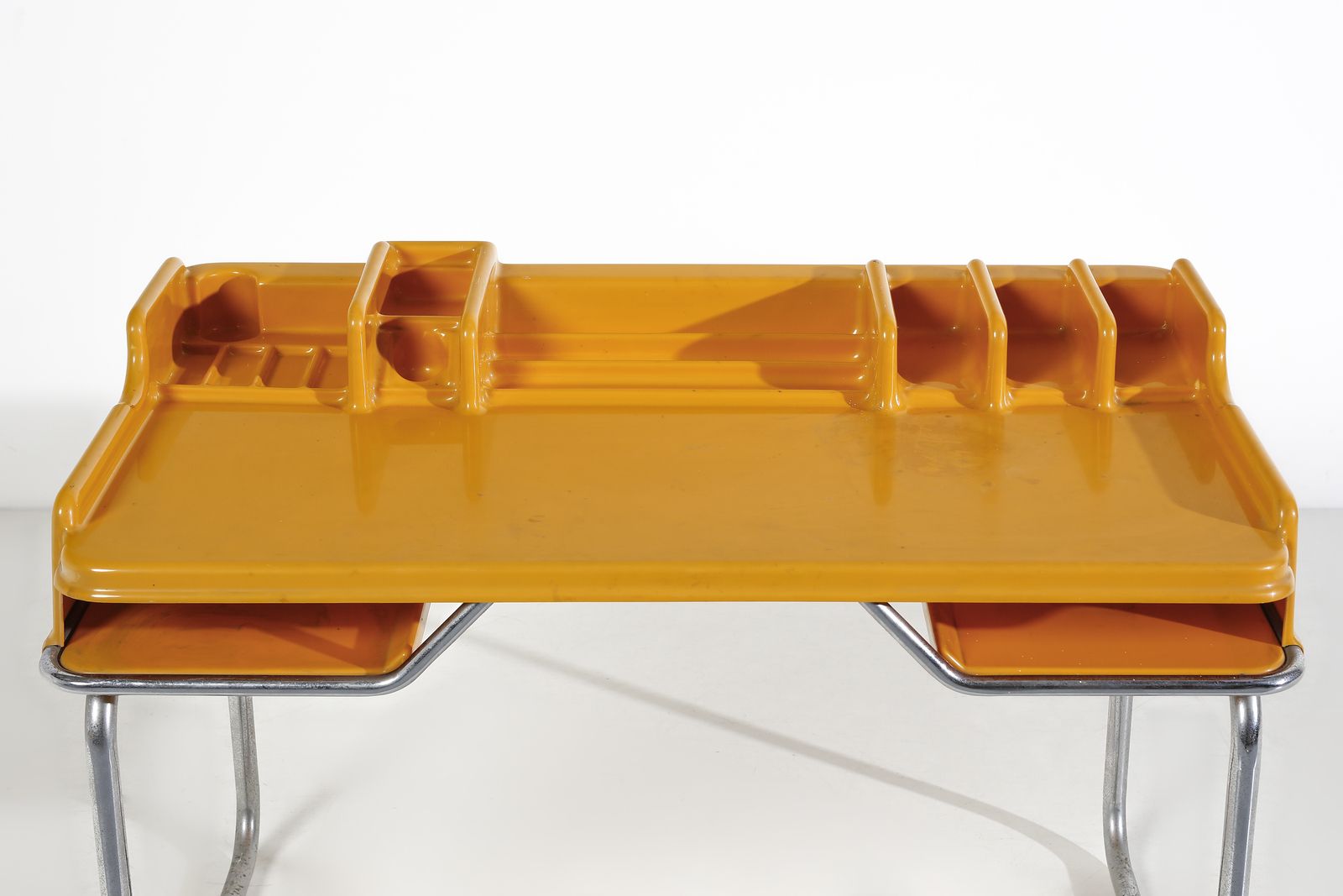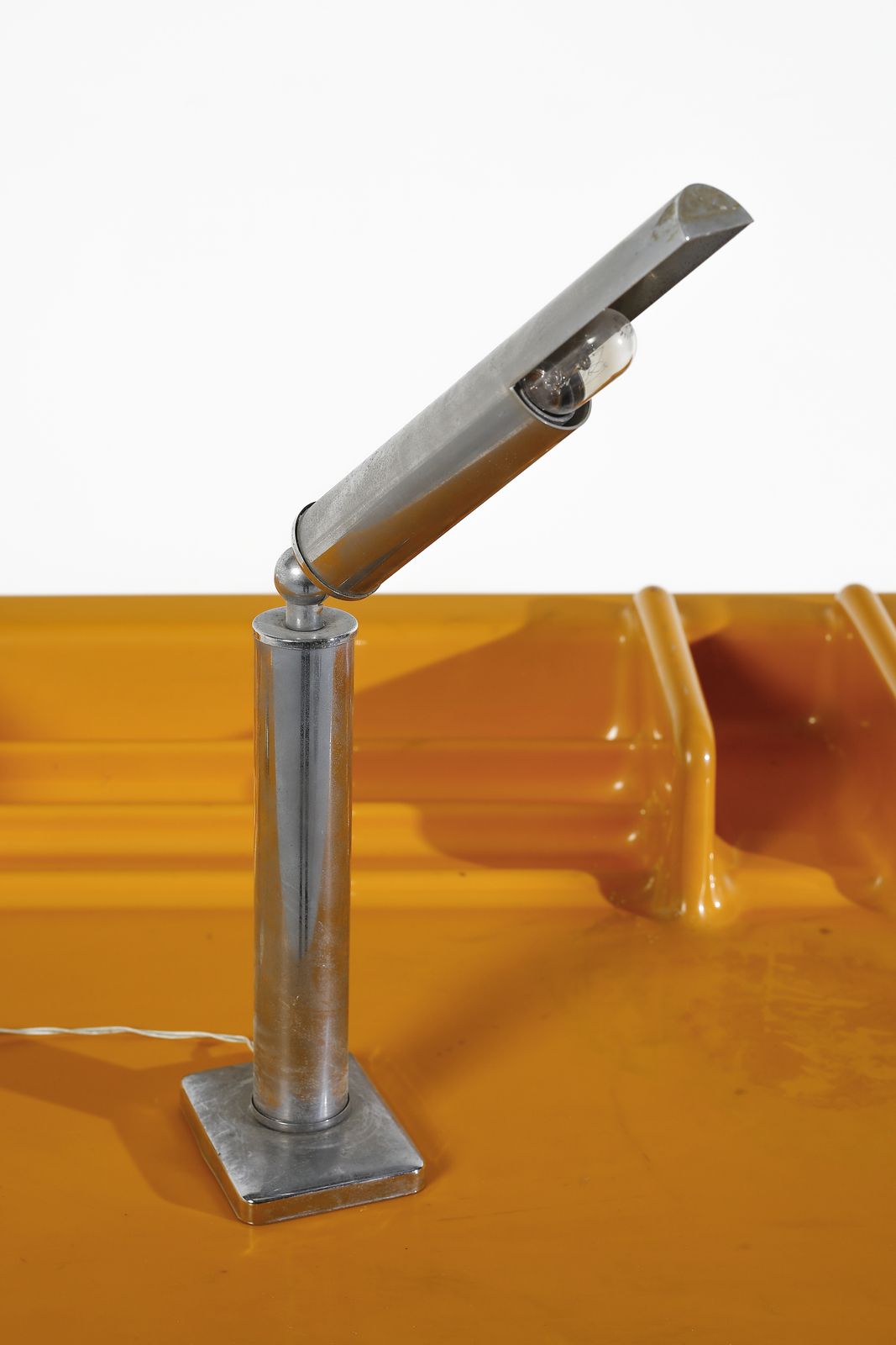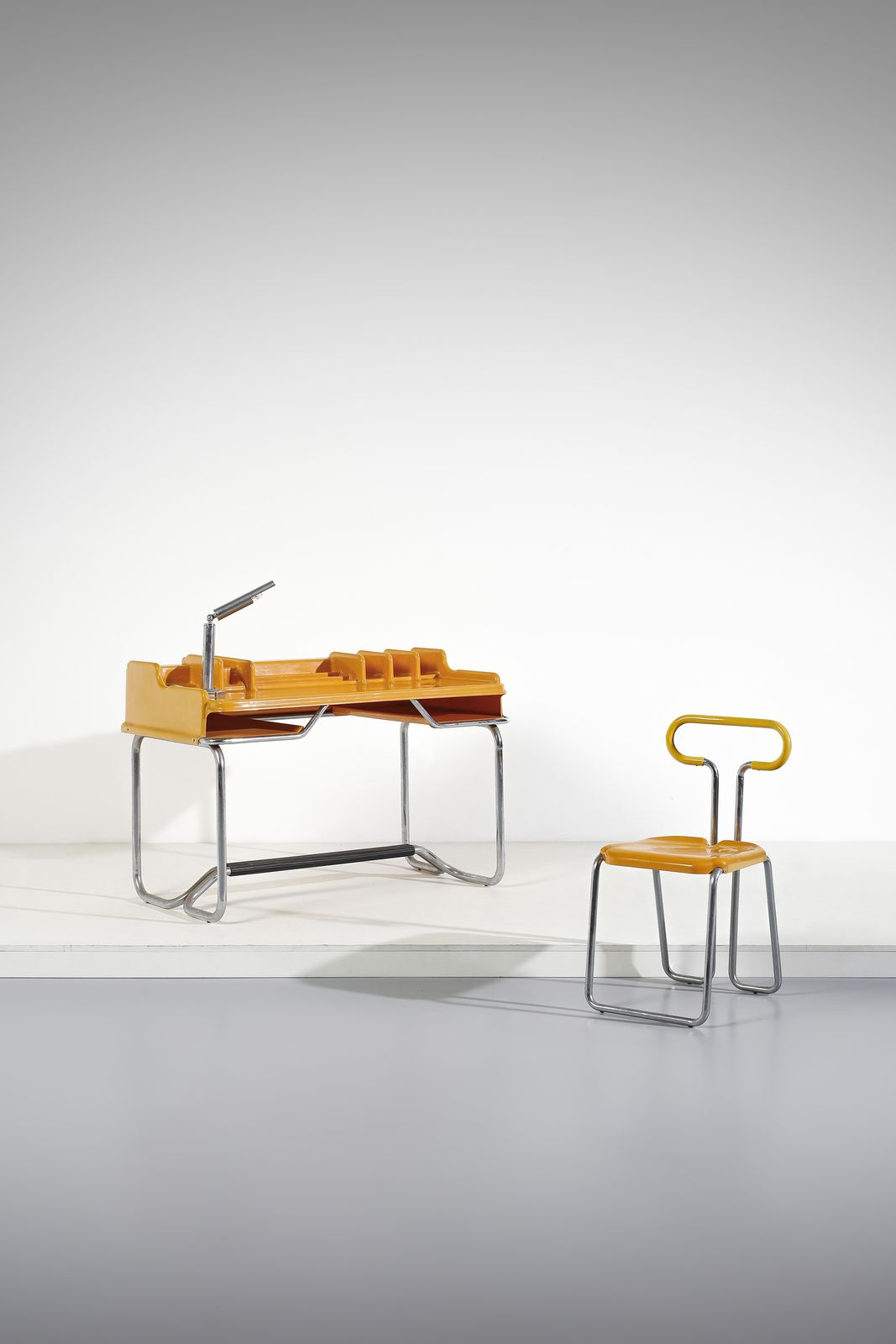 Anni Settanta.Dimensioni: scrittoio 83 x 124 x 68 cm. sedia 81,5 x 41 x 48 cm. lampada l 50 cm