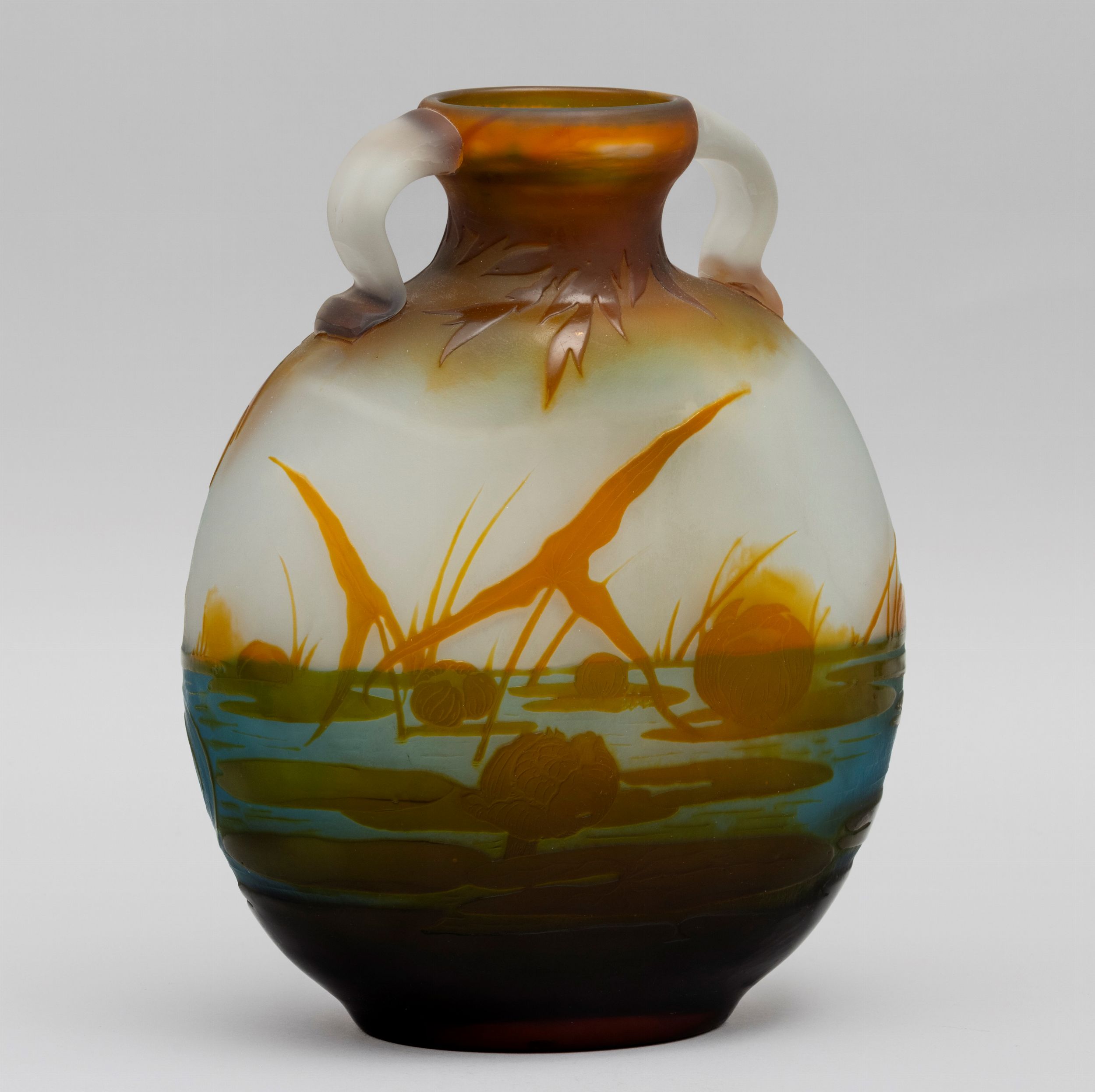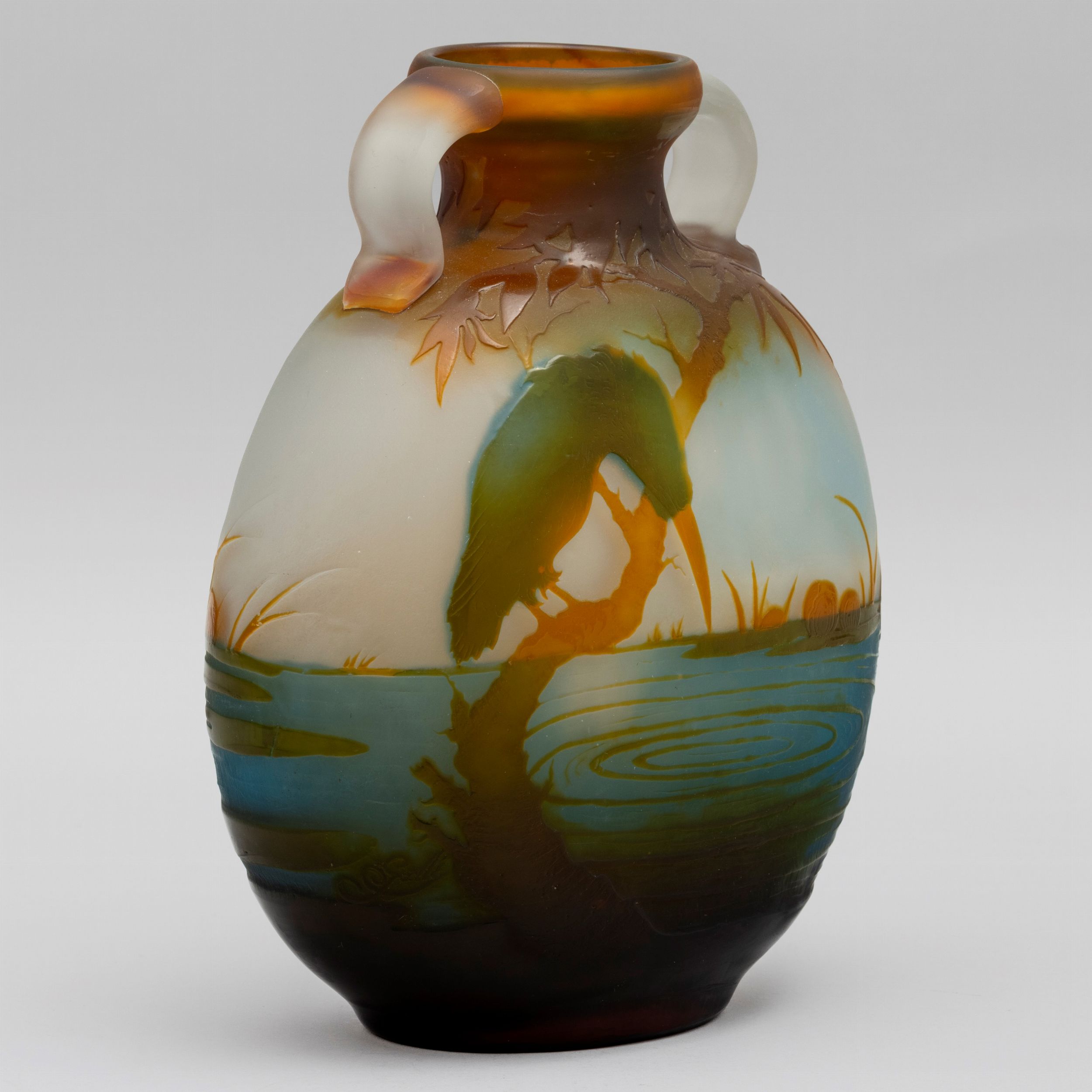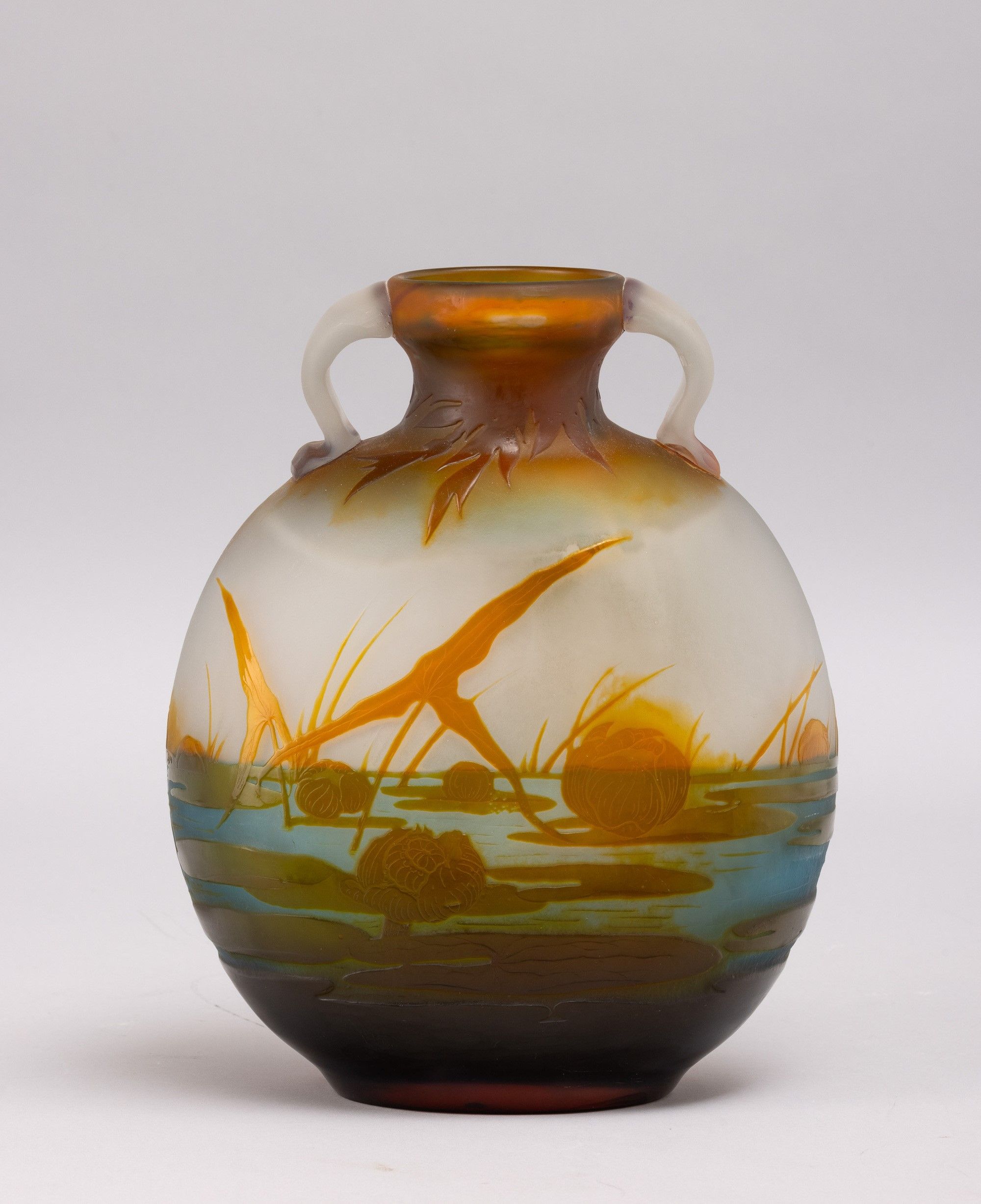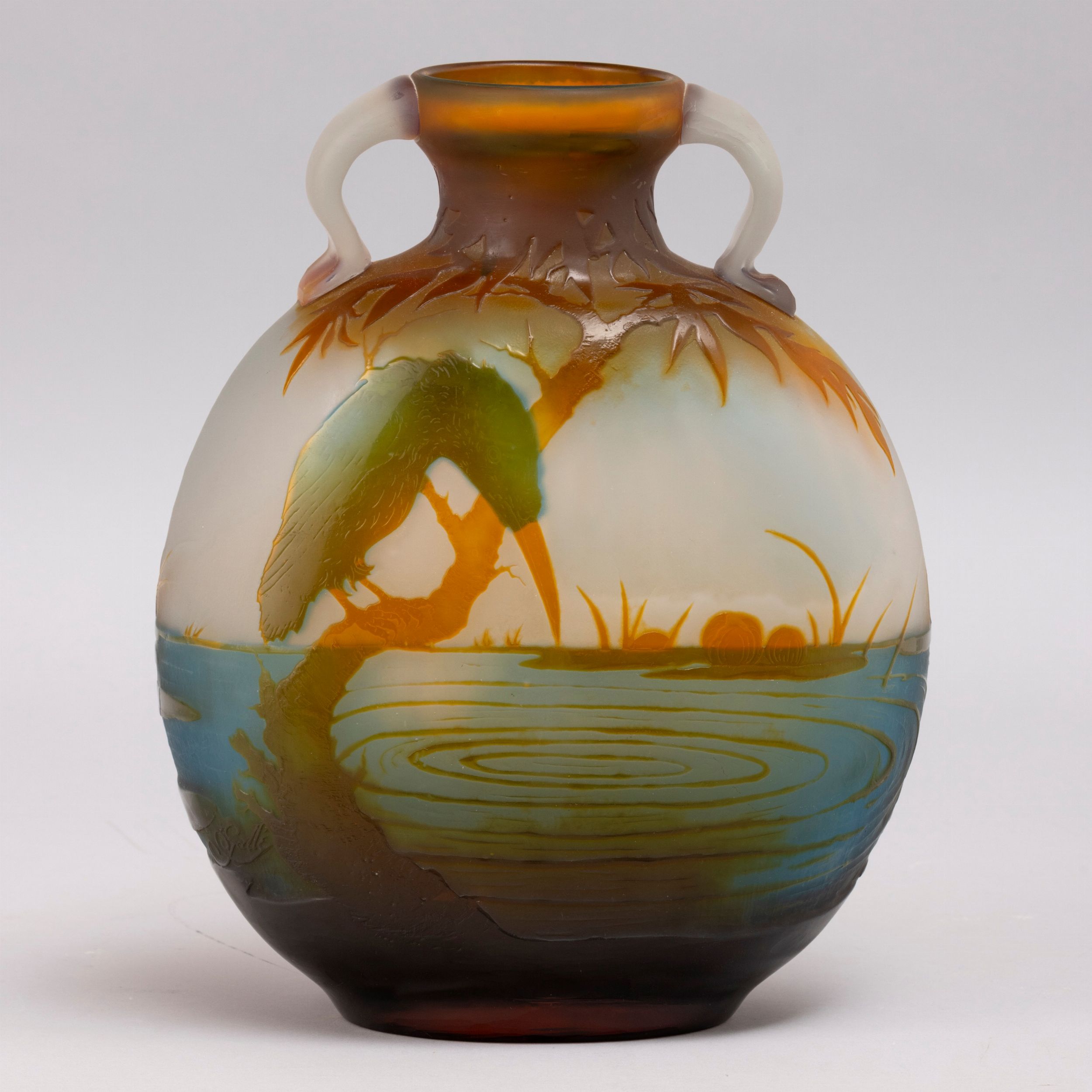 Vaso a fiasca in vetro a cammeo con decoro di paesaggio acquatico e martin pescatore.