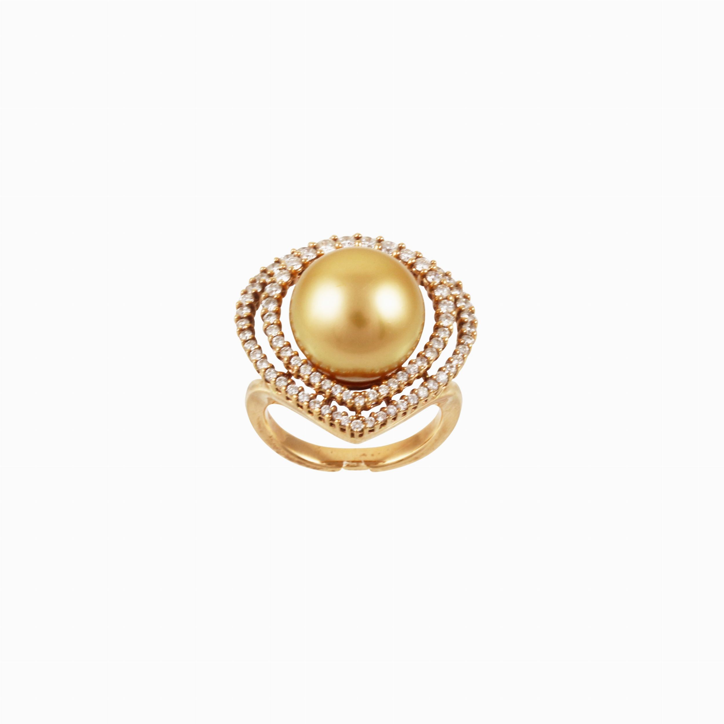 in oro rosa con perla South Sea gold 14 mm, posta al centro di due motivi concentrici a goccia in brillanti, gr. 14,7.Misura 17