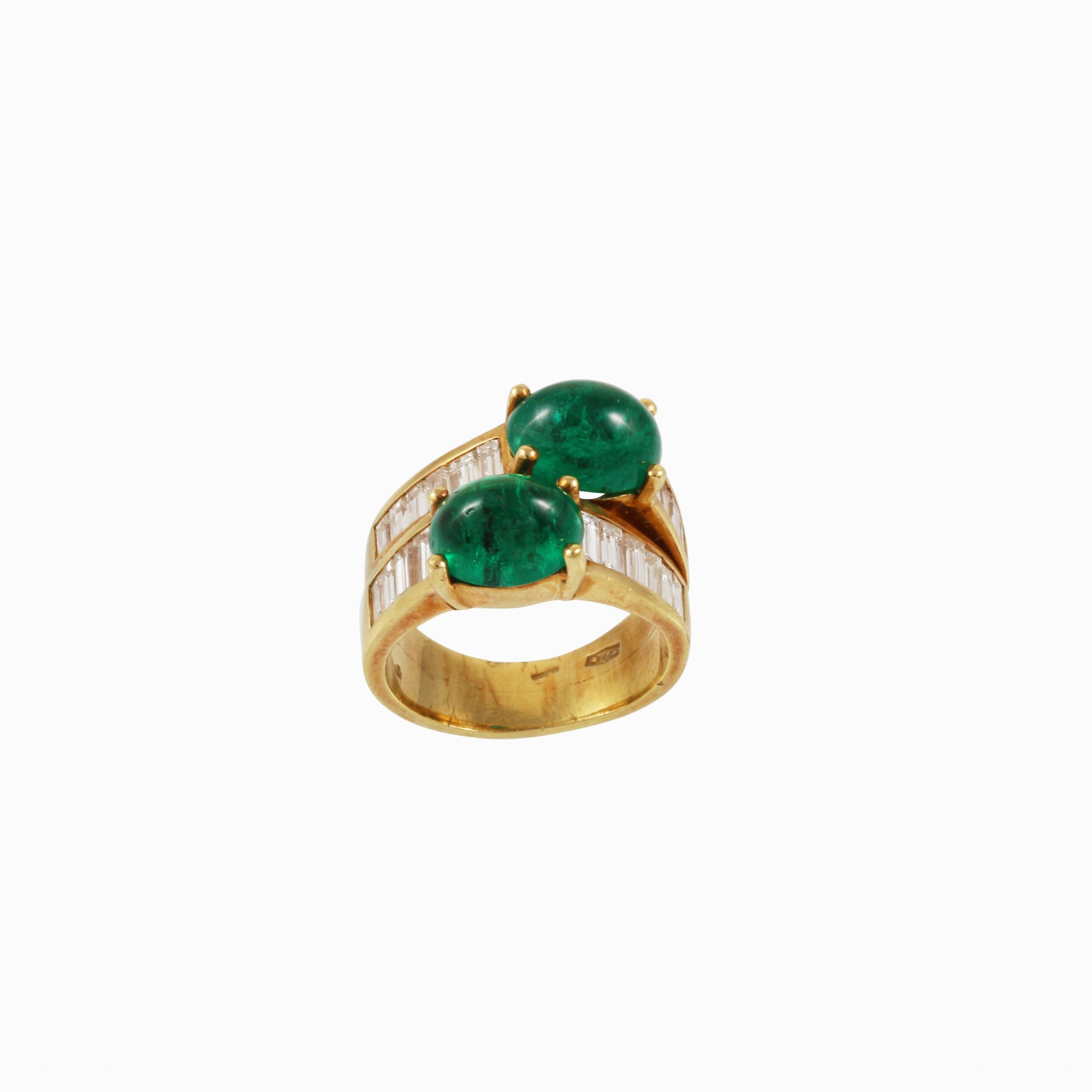 contrarié in oro giallo con due smeraldi ovali taglio cabochon affiancati da diamanti baguettes disposti in linea, gr. 12,2.Misura 13