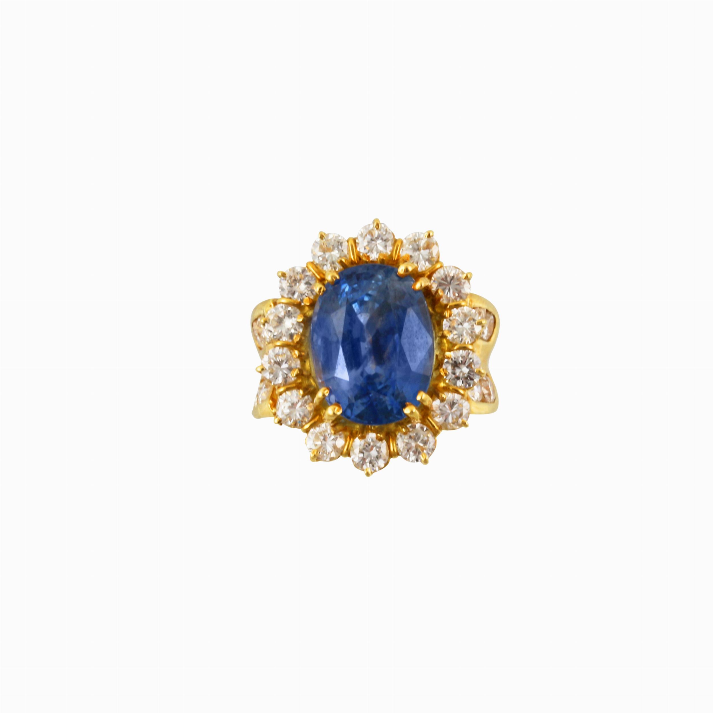 in oro giallo a fascia con zaffiro ovale del peso di 9 ct ca., posto al centro contornato da brillanti, riproposti anche su parte del gambo, del peso complessivo di 2,60 ct ca., gr. 13,1Misura 11