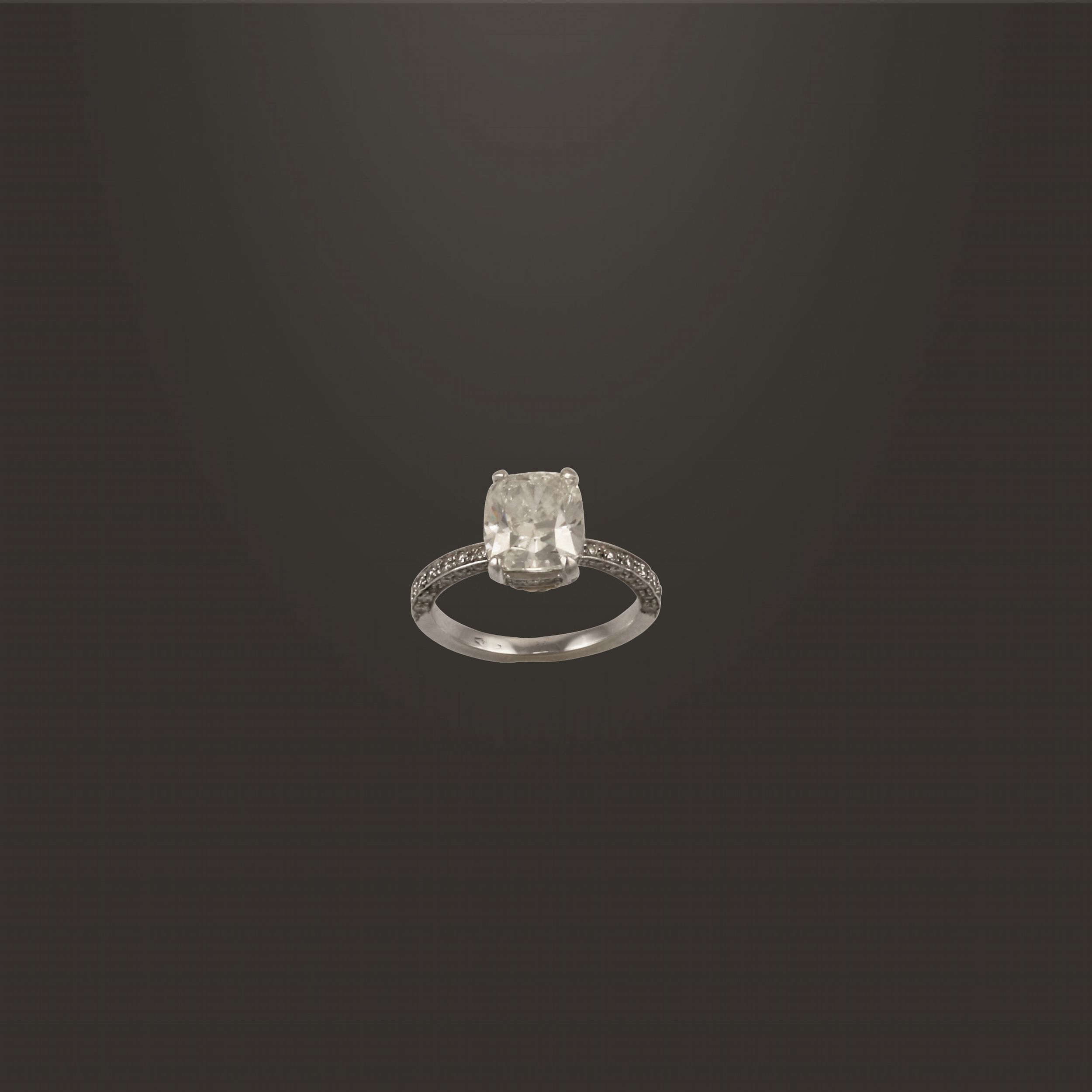 in oro bianco con diamante a cuscino taglio antico europeo del peso di 3,01 ct, impreziosito da piccoli brillanti ripresi anche su parte del gambo, gr. 3,4.