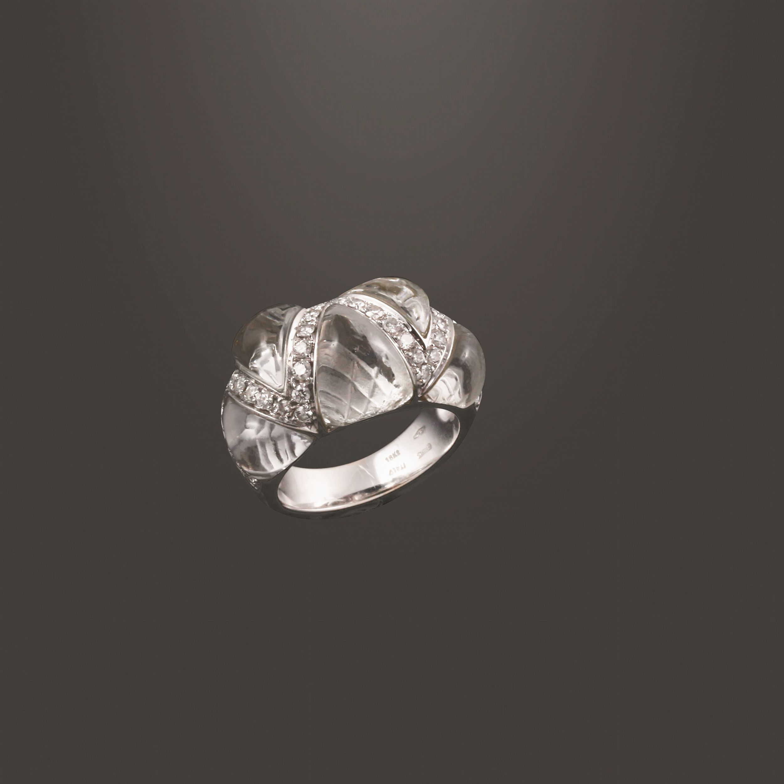 in oro bianco a fascia bombata con cristalli di rocca triangolari e piccoli brillanti, gr. 12,5. Misura 13,5Firmato: Chantecler