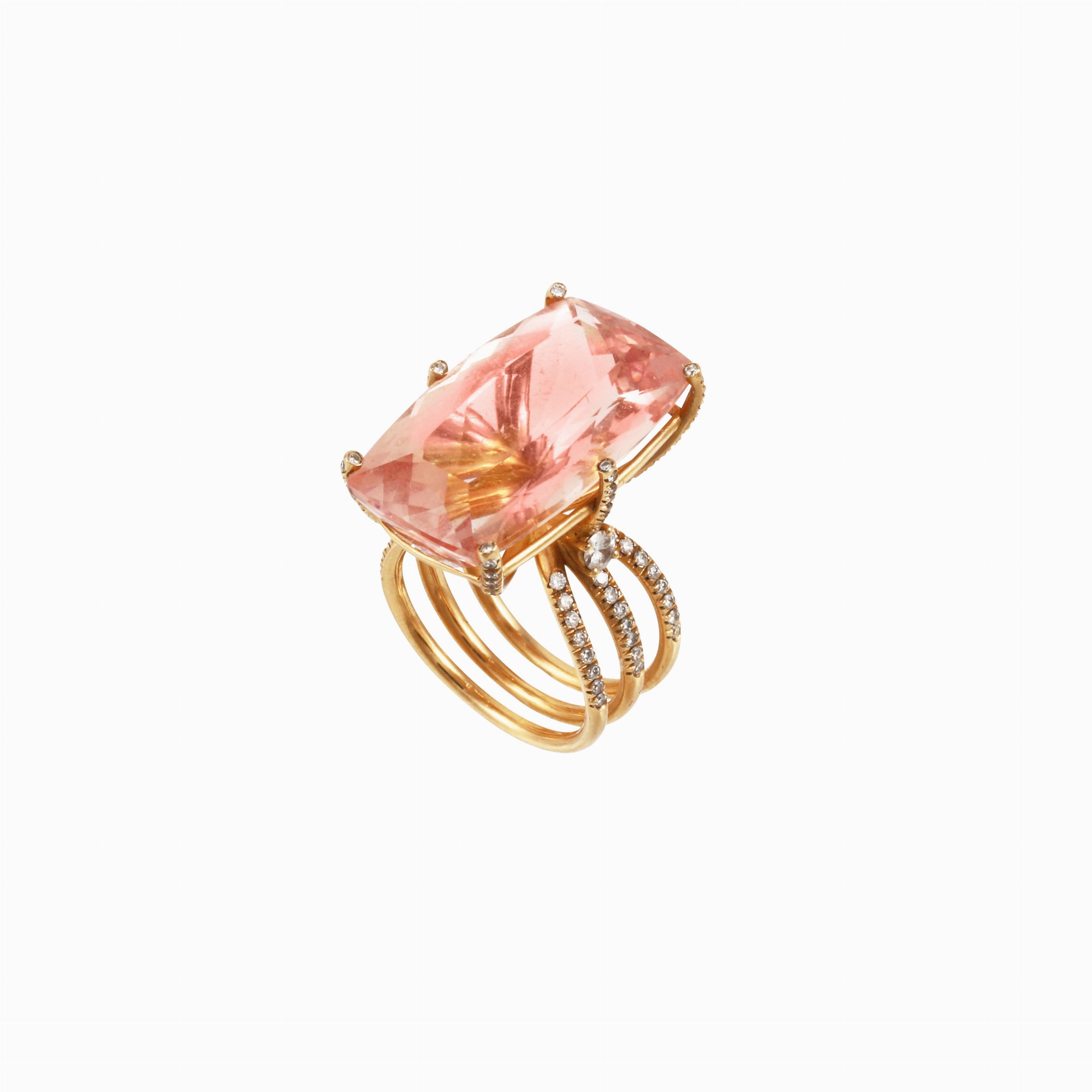 in oro rosa con grande kunzite rettangolare montata su griffe ornato da piccoli brillanti riproposti anche su parte del gambo, gr. 14,6.Misura 18,5Firmato: Cusi