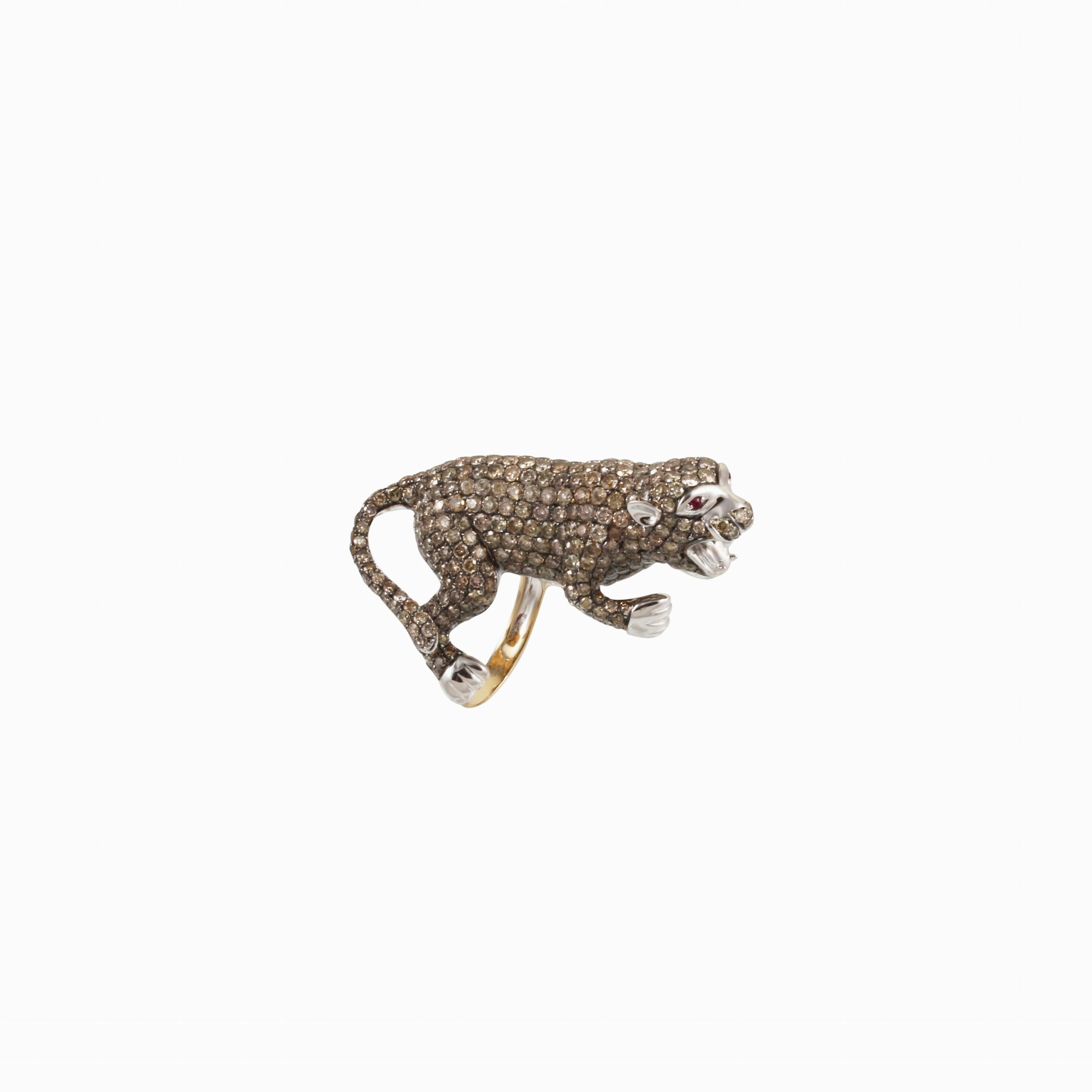 in oro brunito raffigurante una pantera in pavé di brillanti brown del peso complessivo di 4 ct ca. con piccoli rubini per occhi, gr. 18,8.Misura 14Firmato: Paolo Piovan