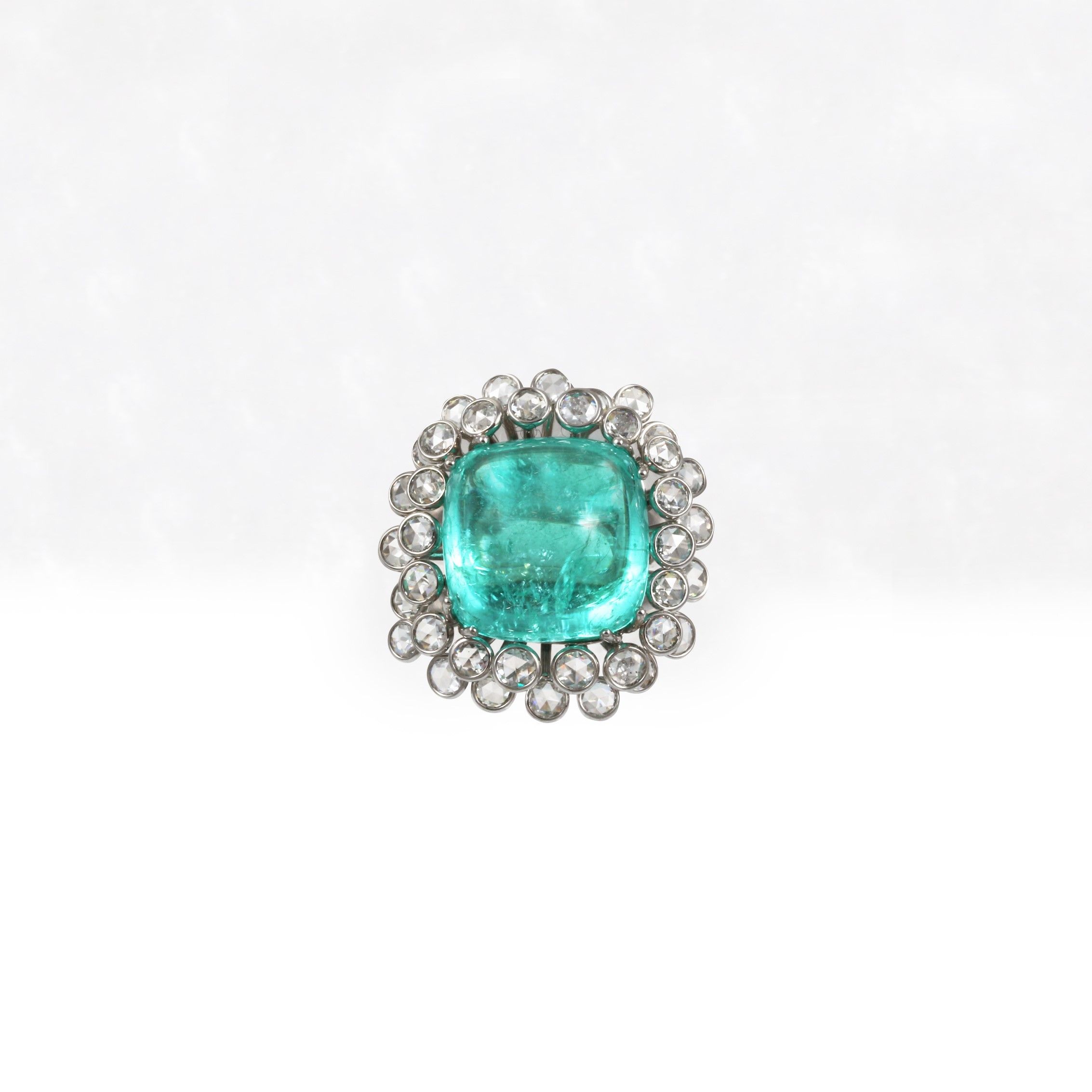 in oro bianco con grande tormalina paraiba taglio cabochon del peso di 29,79 ct, contornata da doppio giro di diamanti taglio a rosa, gr. 28,2.Misura 19Analisi gemmologica n. 56722 del 04/03/2024, rilasciata dal laboratorio IGI di Milano