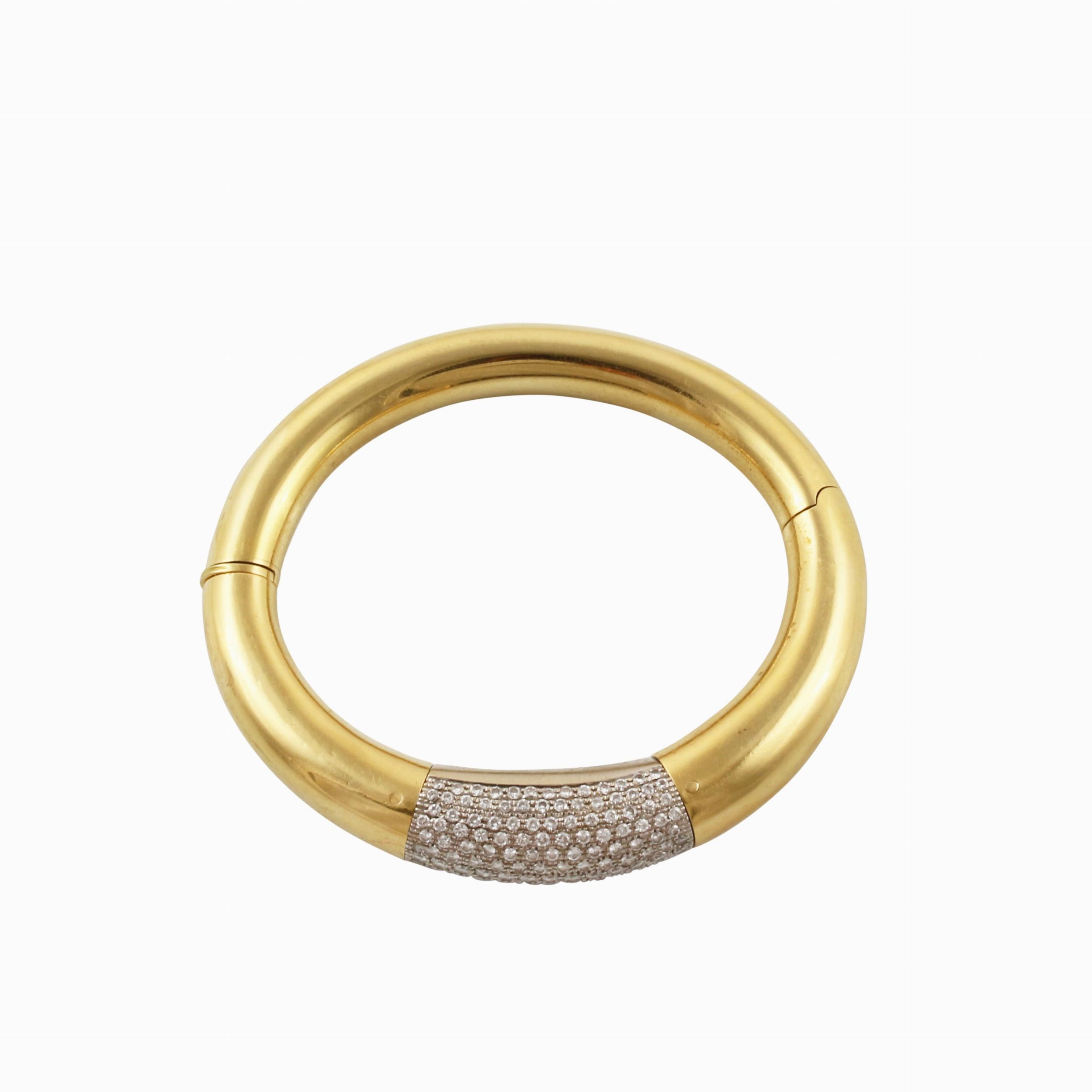 rigido tubolare in oro giallo con riporto centrale in oro bianco impreziosito da pavé di brillanti del peso complessivo di 1,40 ct ca., gr. 46,1.