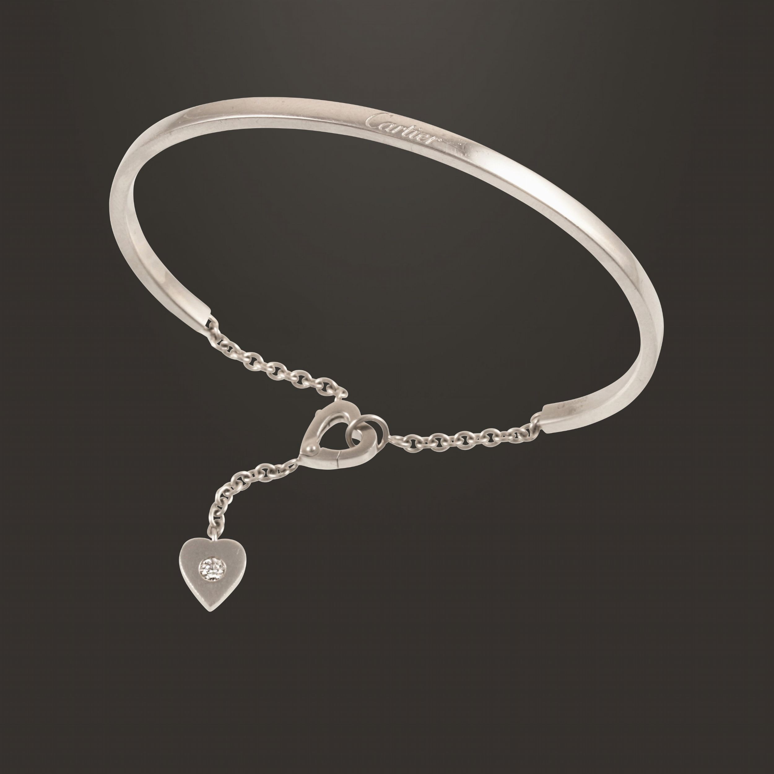 in oro bianco rigido e catenella con chiusura a forma di cuore e pendente sospeso a cuore con piccolo brillante, gr. 16,7.Misura 17Firmato: Cartier 17Numerato: ©NQ5902