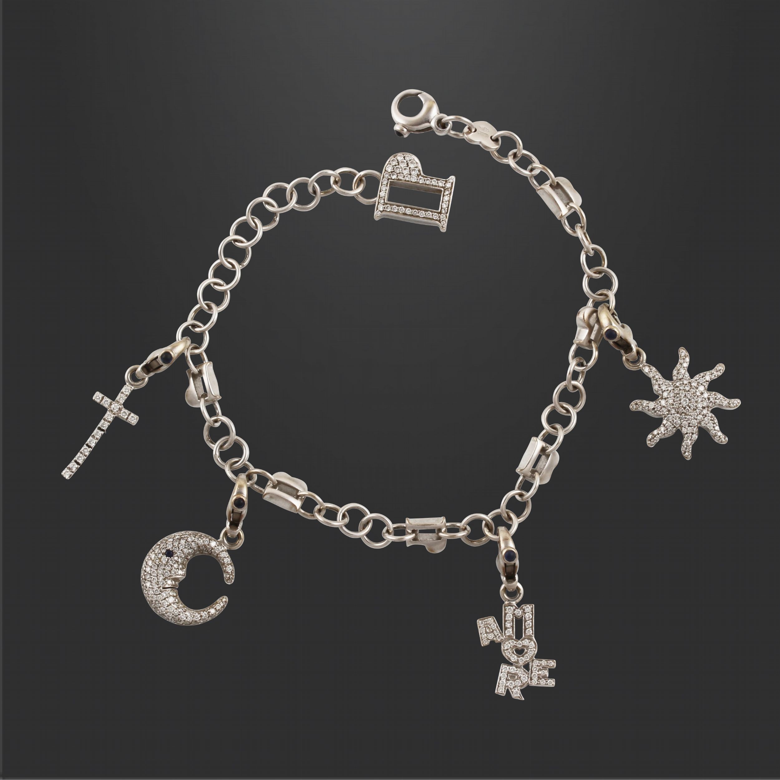 in oro bianco a maglie tonde con charms a soggetti vari ornati da brillanti e piccoli zaffiri, gr. 34,8.Lunghezza 23 cm (regolabile)Firmato: Pasquale Bruni