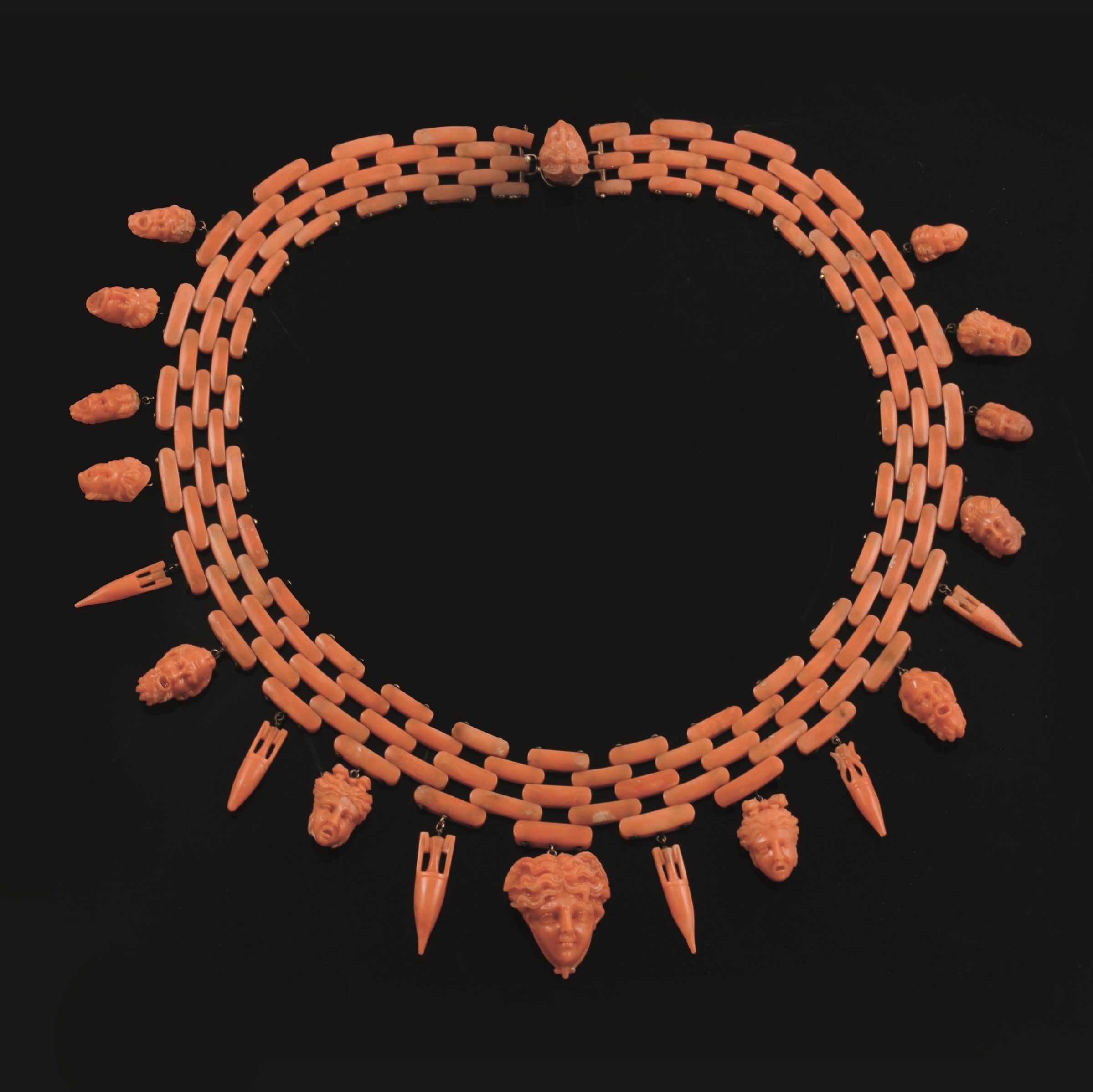 girocollo in corallo costituito da segmenti articolati con pendenti d'ispirazione mitologica, montatura in oro a titolo basso, gr. 84,7Lunghezza 45 cm ca.