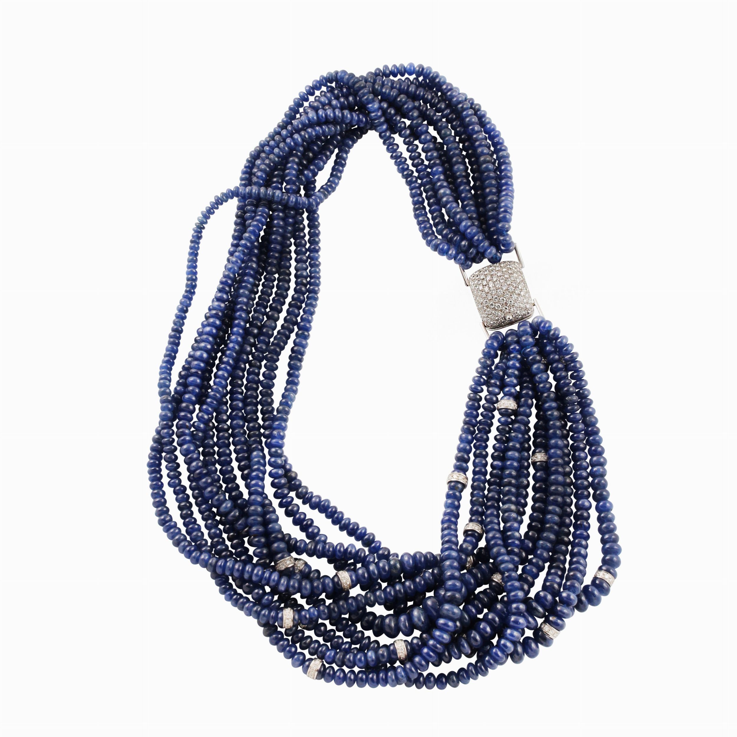girocollo a dieci fili di zaffiri digradanti del peso complessivo di 900 ct ca. con parte anteriore ornata da rondelle in oro bianco e brillanti. Fermezza laterale bombata in oro bianco con pavé di brillanti del peso complessivo di 3 ct ca., gr. 218,6.
