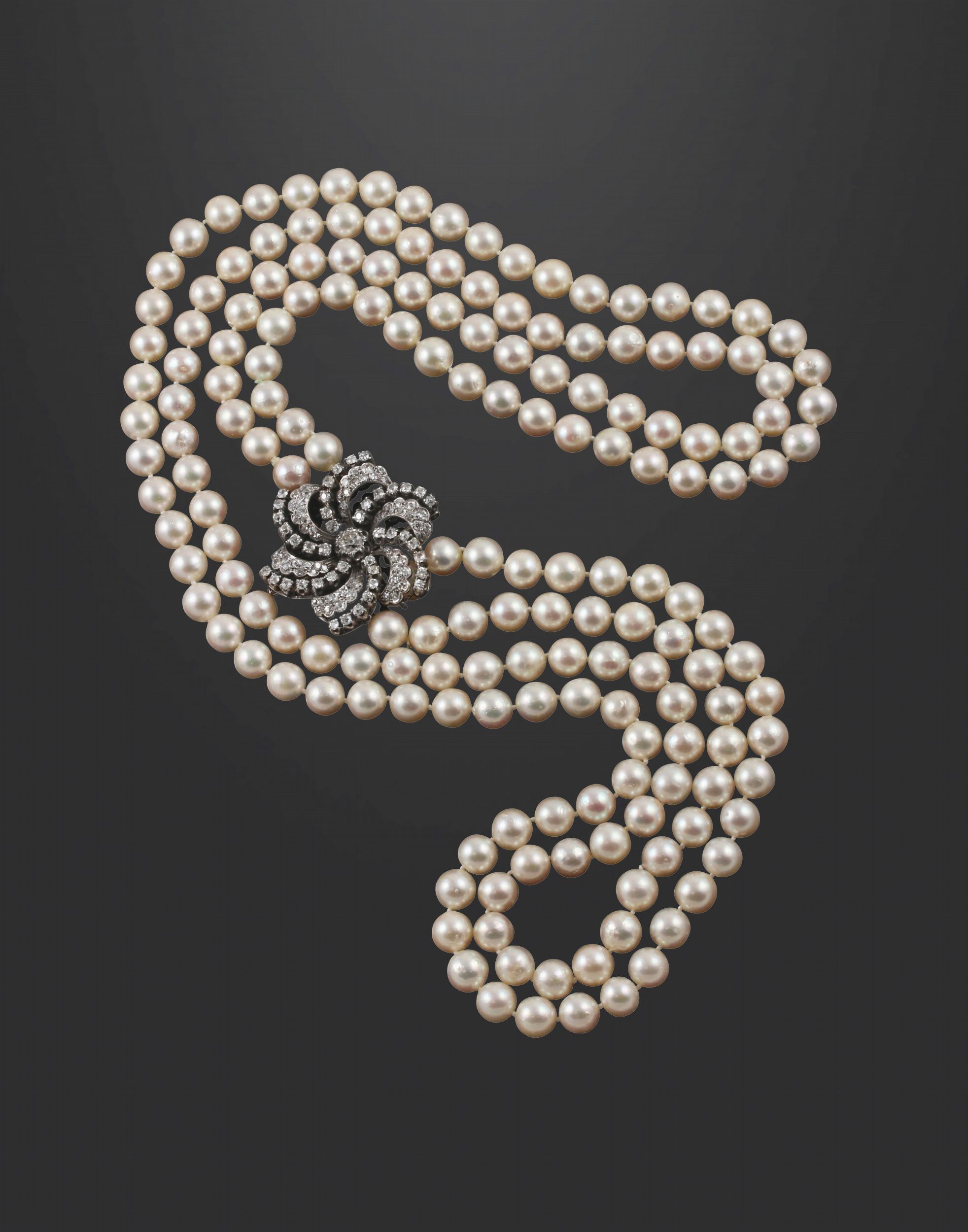 a due fili di perle 9 mm con ornamento laterale a guisa di fiore traforato ornato da diamanti.Lunghezza 75 cm ca.