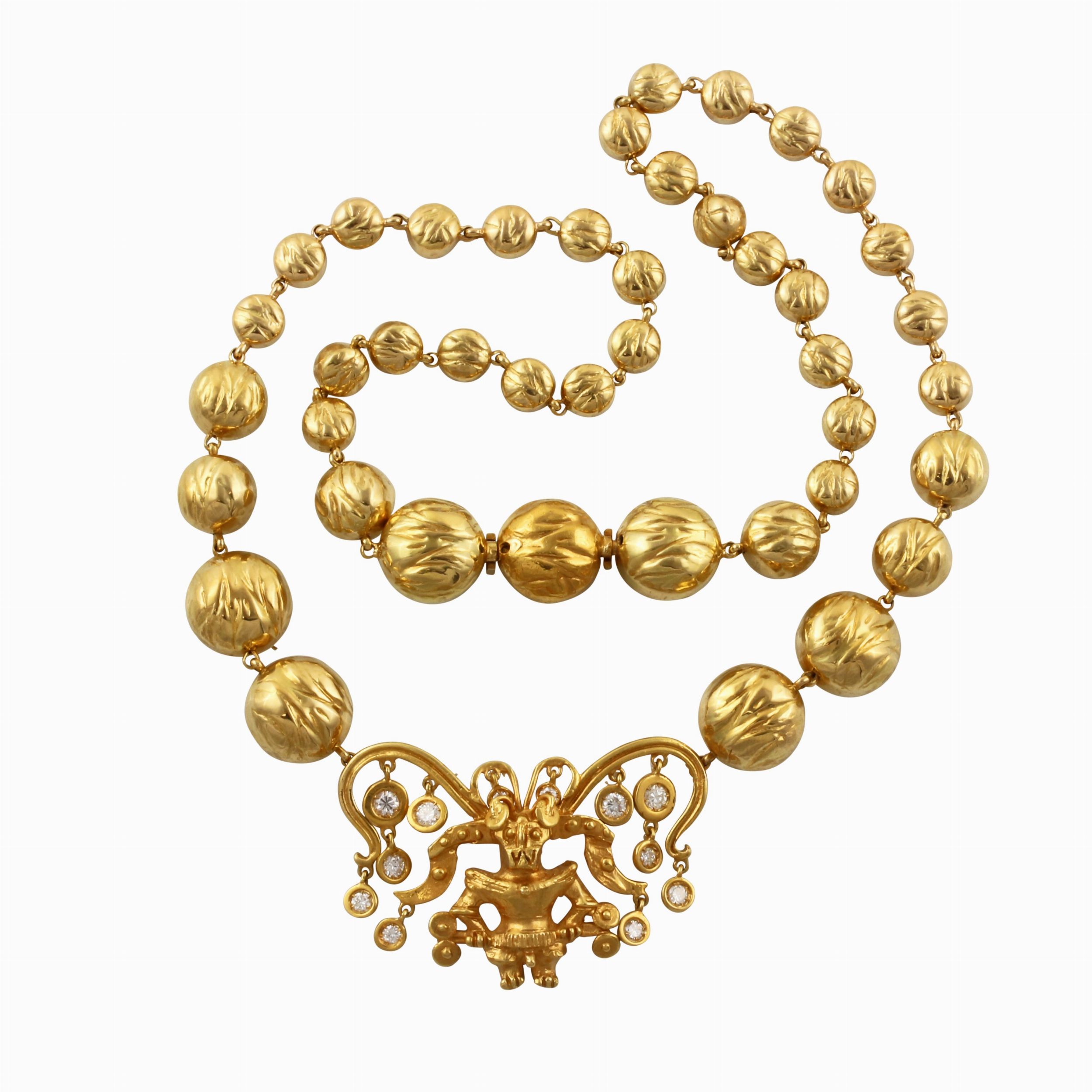 in oro giallo con boules scanalate poste in gradazione, evidenziata anteriormente da un motivo raffigurante una divinità azteca impreziosita da pendenti in brillanti del peso complessivo di 1,20 ct ca., gr. 62,4.