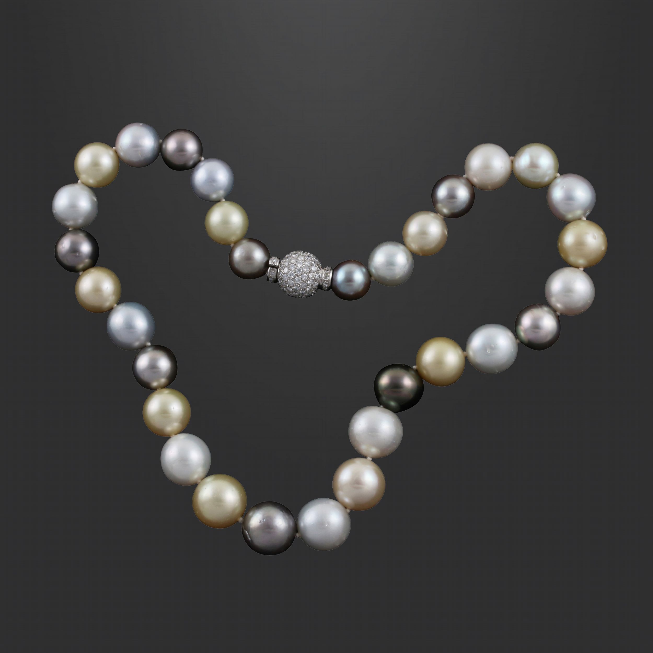 ad un filo di perle South Sea multicolor, poste in gradazione 15,5 / 12 mm, chiusura a sfera in pavé di brillanti del peso di 2,50 ct ca. Corredata da custodia.Lunghezza 47 cm