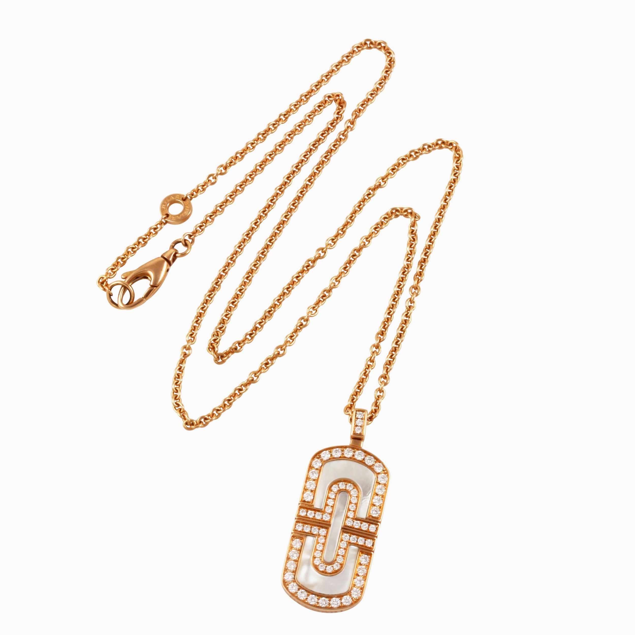 in oro rosa con pendente in brillanti e madreperla sostenuto da catena, gr. complessivi 19.Lunghezza 53 cmFirmata: Bulgari