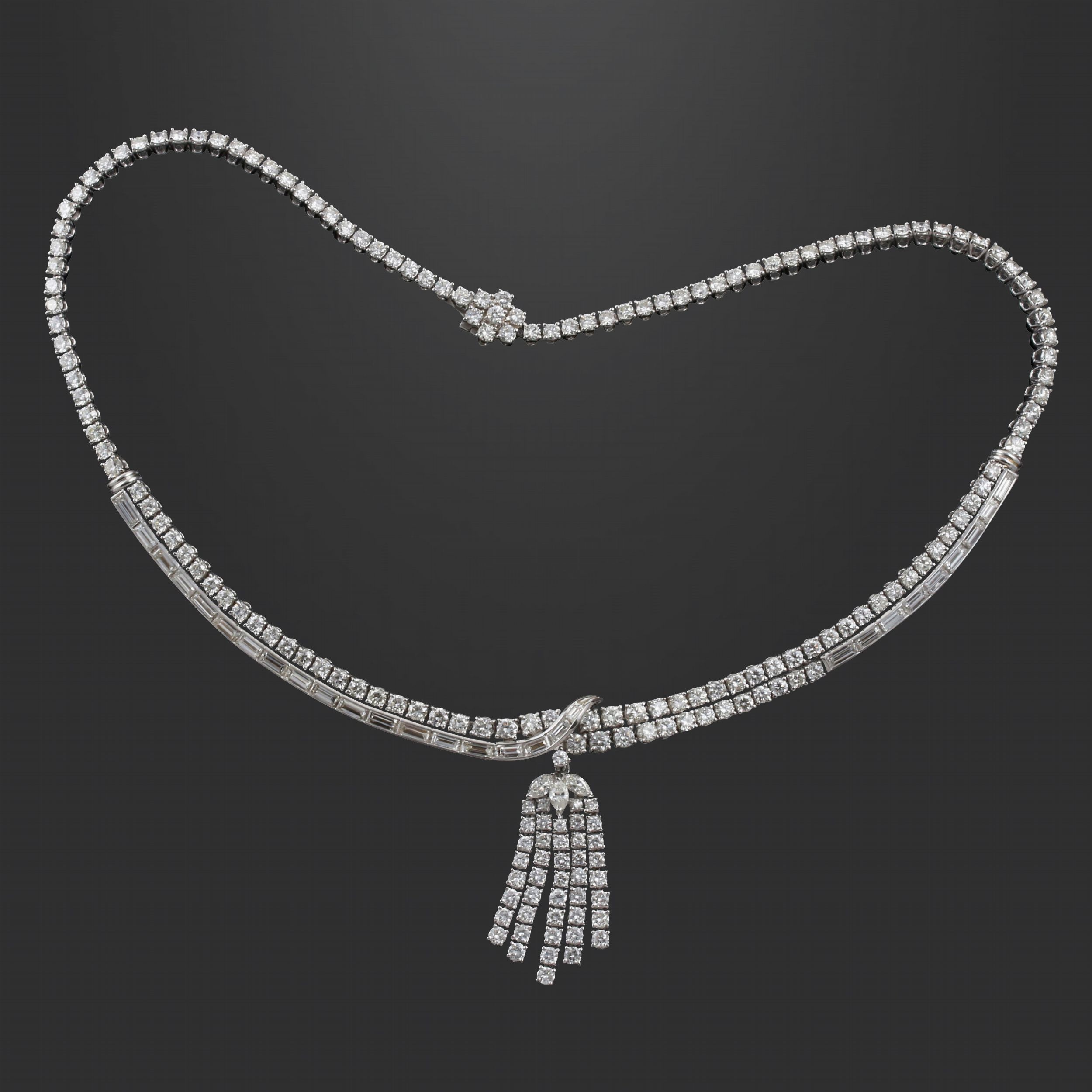 rivière in oro rodiato con brillanti e diamanti baguettes a sostegno di un pendente staccabile a morbida frangia con brillanti e diamanti navettes, gr. 48,7. Diamanti del peso complessivo di 20 ct ca. Corredata da certificato di garanzia della Maison. Lunghezza 41 cm Firmata: Casa Damiani