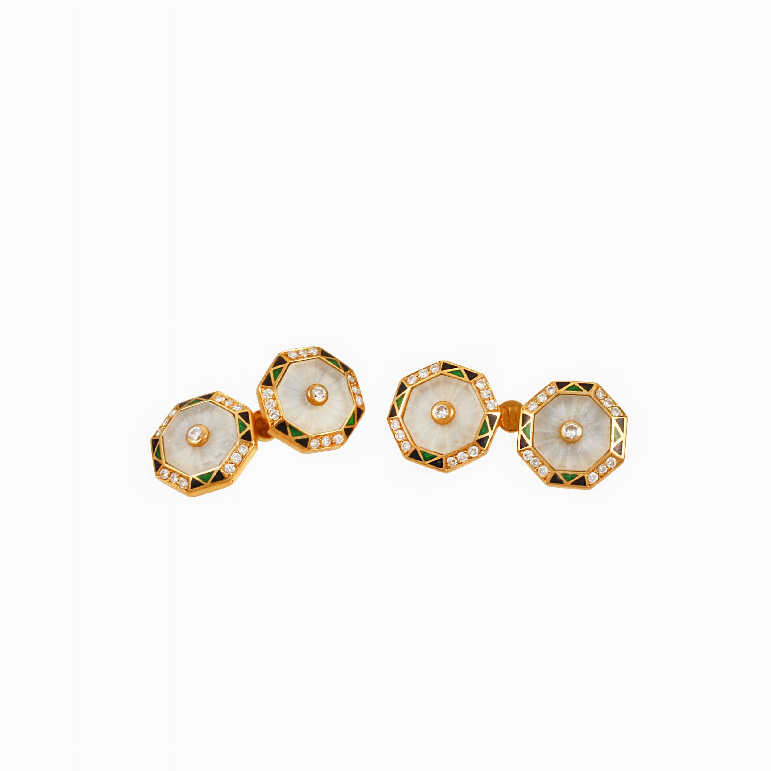in oro giallo a forma ottagonale con cristallo di rocca inciso, piccoli brillanti e smalti, gr. 13,1.