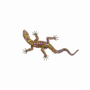 in oro bianco e brunito a guisa di geco in pavé di corindoni dai vari colori con catenina a maglie tonde in [..]