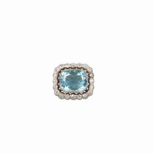 in oro bianco con acquamarina del peso di 9 ct ca., contornata da diamanti del peso complessivo di 2 ct ca., [..]