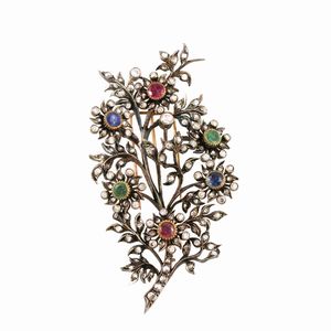 a ramage impreziosita da diamanti, rubini, zaffiri e smeraldi, realizzata in argento e oro, gr. 45. Dimensioni [..]