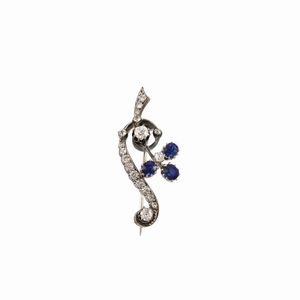 a guisa di tralcio fiorito realizzata in oro e argento con zaffiri e diamanti, gr. 5,3. Dimensioni 4 x 1,5 cm [..]