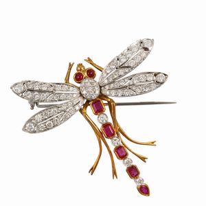 libellula realizzata in oro giallo e bianco ornata da brillanti e rubini, gr. 18,2. Dimensioni 5,5 x 5,2 cm ca. [..]