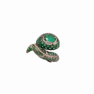 serpente traforato realizzato in oro brunito con smeraldi (uno mancante) e piccoli brillanti ad ornamento, gr. [..]