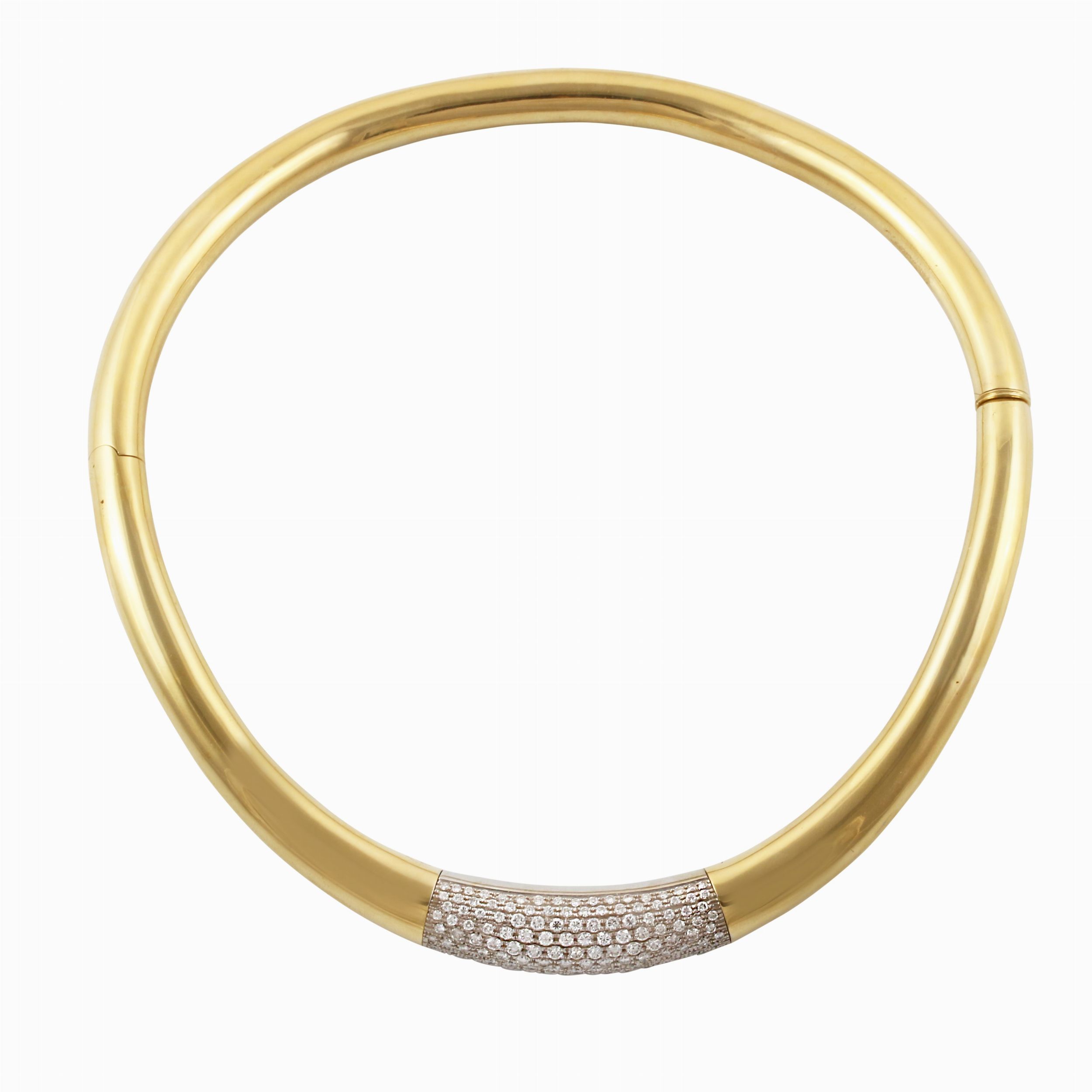 rigido tubolare in oro giallo con riporto centrale in oro bianco impreziosito da pavé di brillanti del peso complessivo di 2,40 ct ca., gr. 83,9.Misura 40 cm ca. Numerario: 10 MI (Micheletto s.r.l. - Milano)