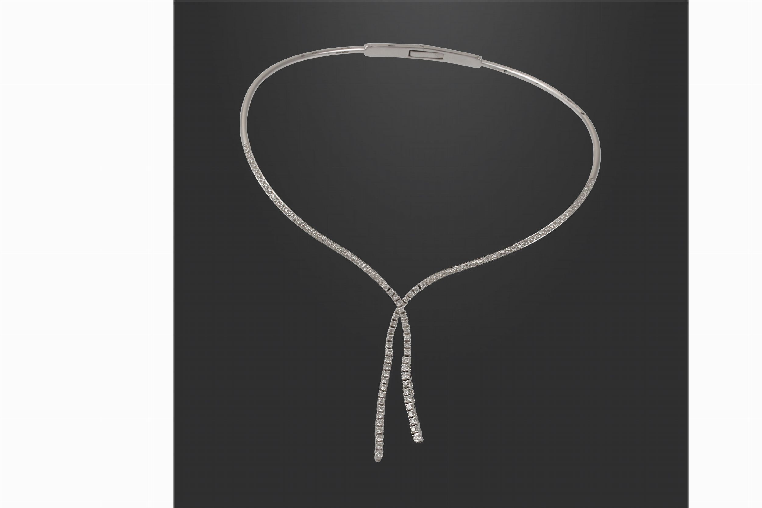 rigido con parte anteriore ornata da brillanti disposti in linea che proseguono lungo i due pendenti sospesi, realizzato in oro bianco, gr. 39,4. Diamanti del peso complessivo di 2,70.Misura regolabileFirmato: Damiani