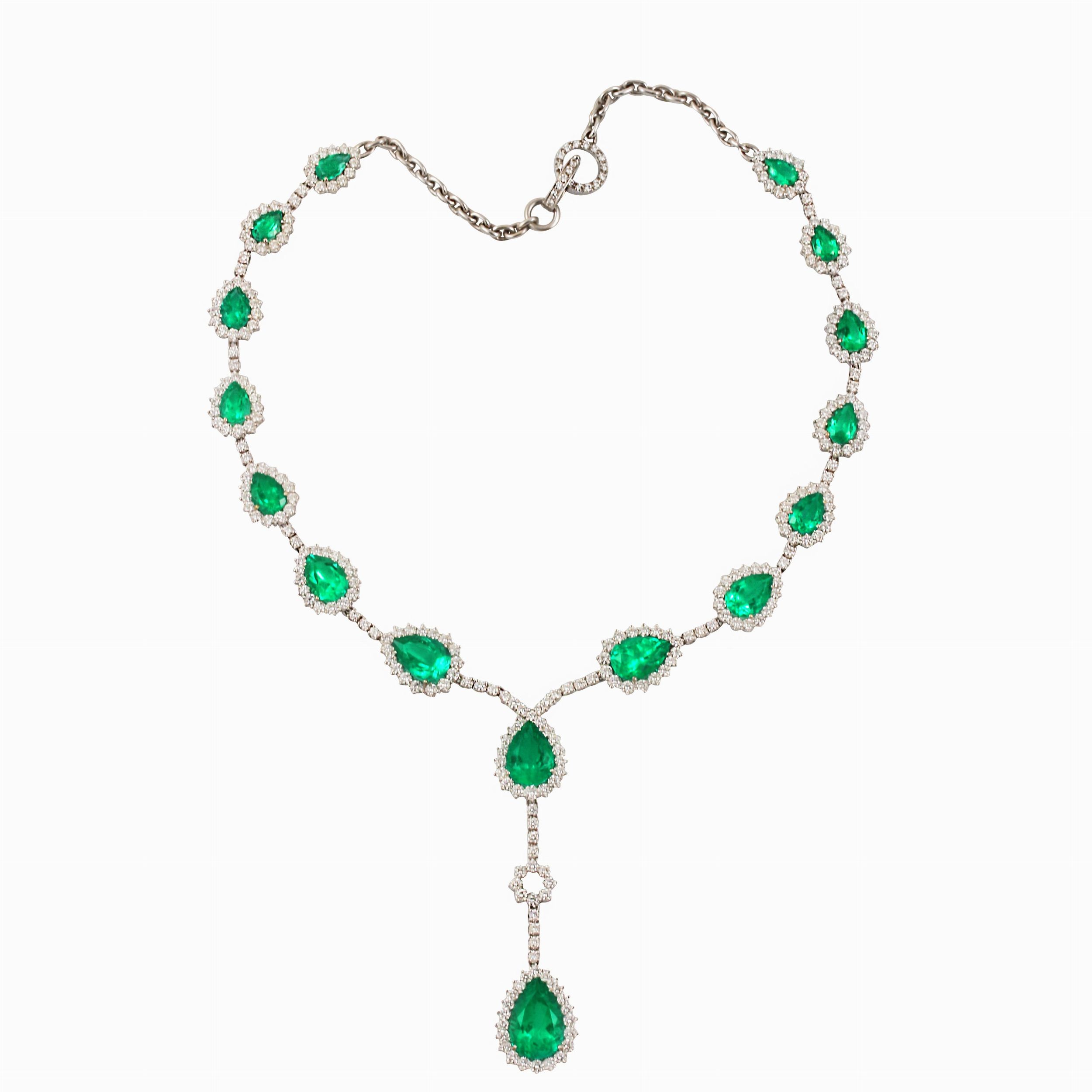 in oro bianco con brillanti del peso complessivo di 15 ct ca. intervallata da smeraldi a goccia posti in gradazione di cui uno sospeso al centro del peso complessivo di 46 ct ca., gr. 73,1.Lunghezza 47 cm