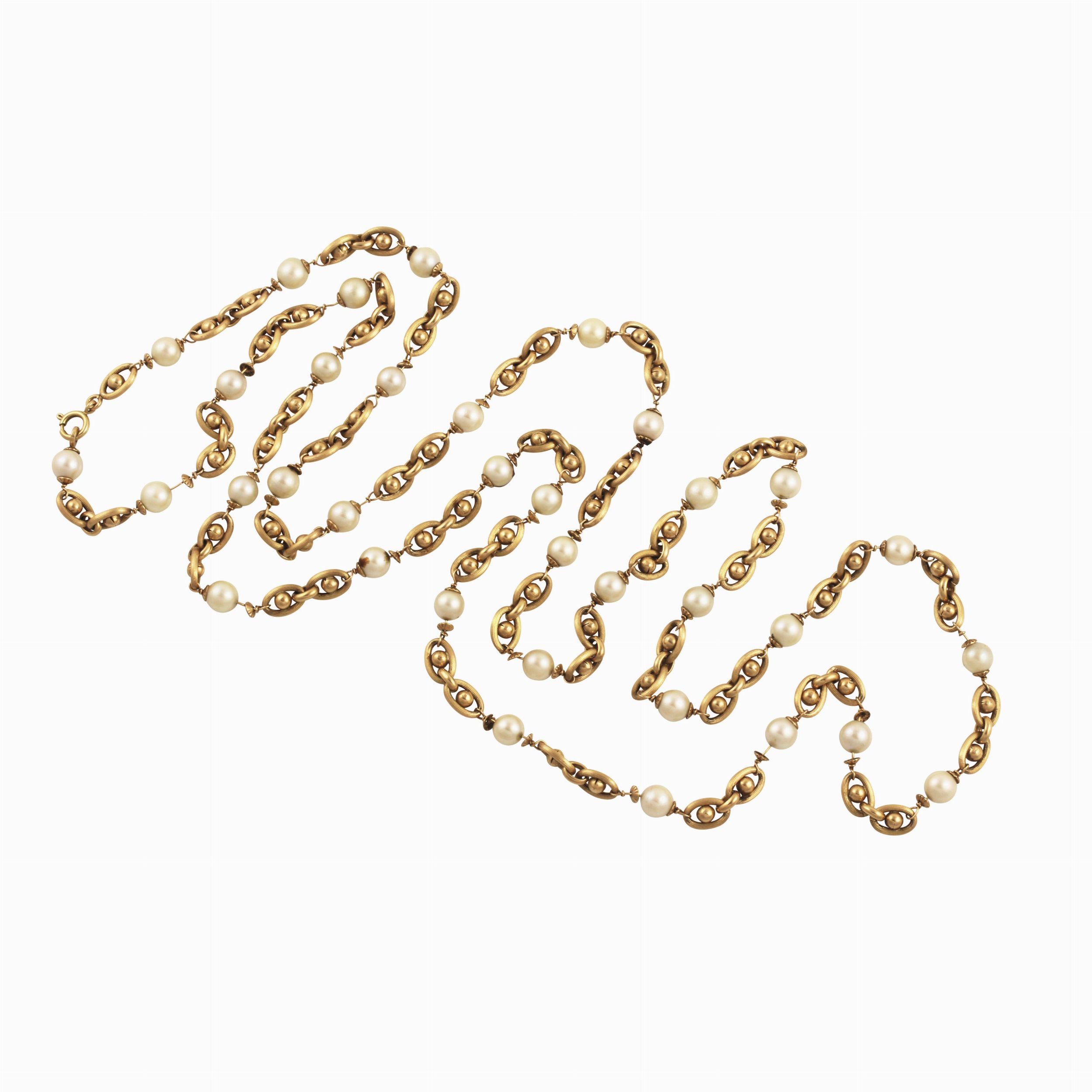 in oro giallo con maglie ovali centrate da piccole sfere in oro giallo inframezzata da perle, gr. 59.Lunghezza 127 cm