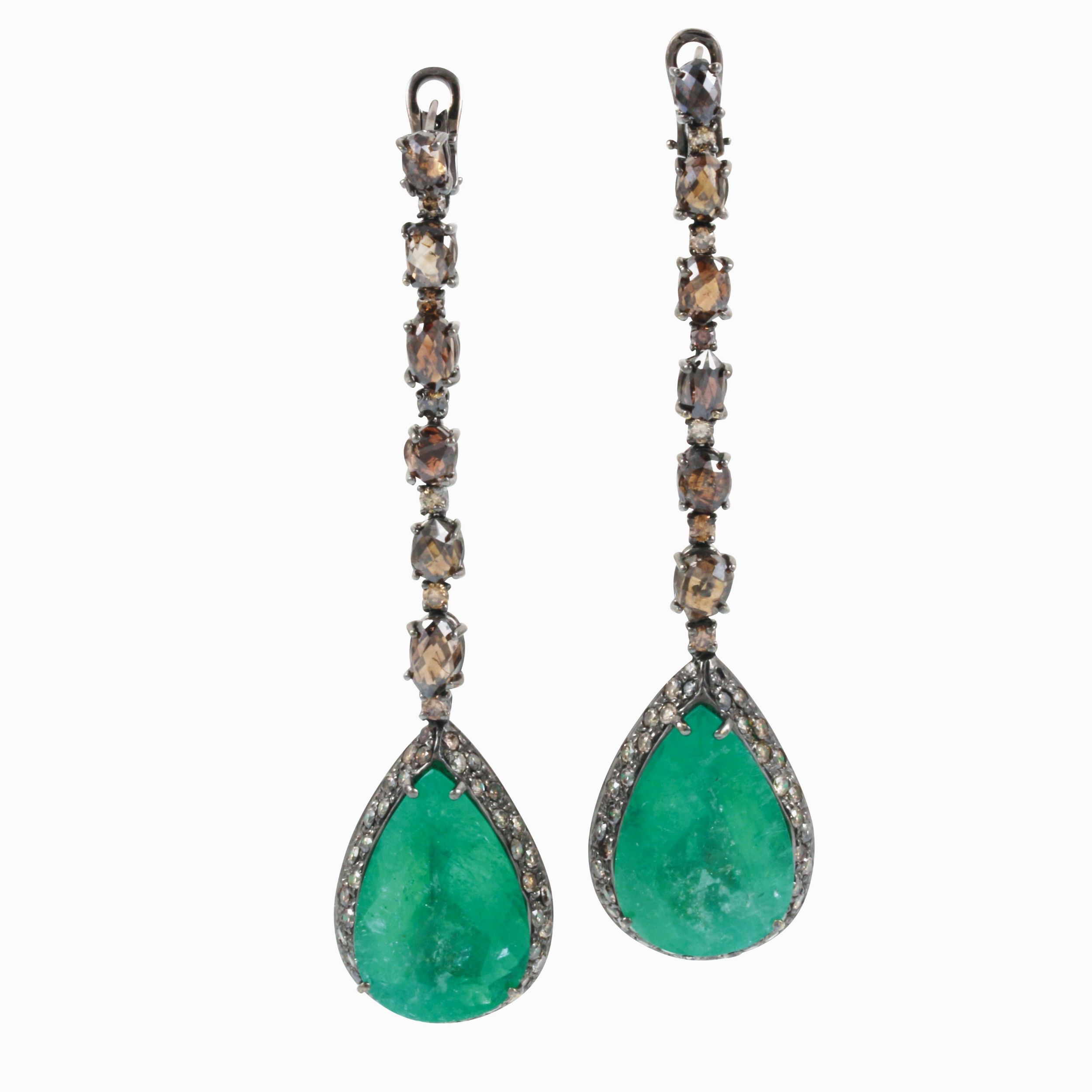 lunghi pendenti in oro brunito con brillanti e diamanti ovali taglio briolette brown ciascuno a sostegno di uno smeraldo a goccia, gr. 32,1.Lunghezza 8 cm ca.